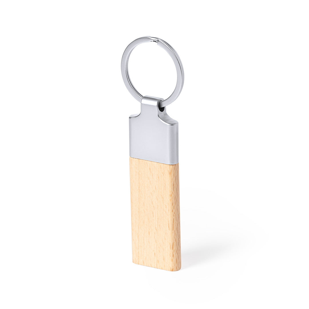 Llavero en combinación de materiales metal de acabado brillante y madera de haya barnizada. Con amplia superficie para marcaje y presentado en bolsa individual con tarjeta kraft.