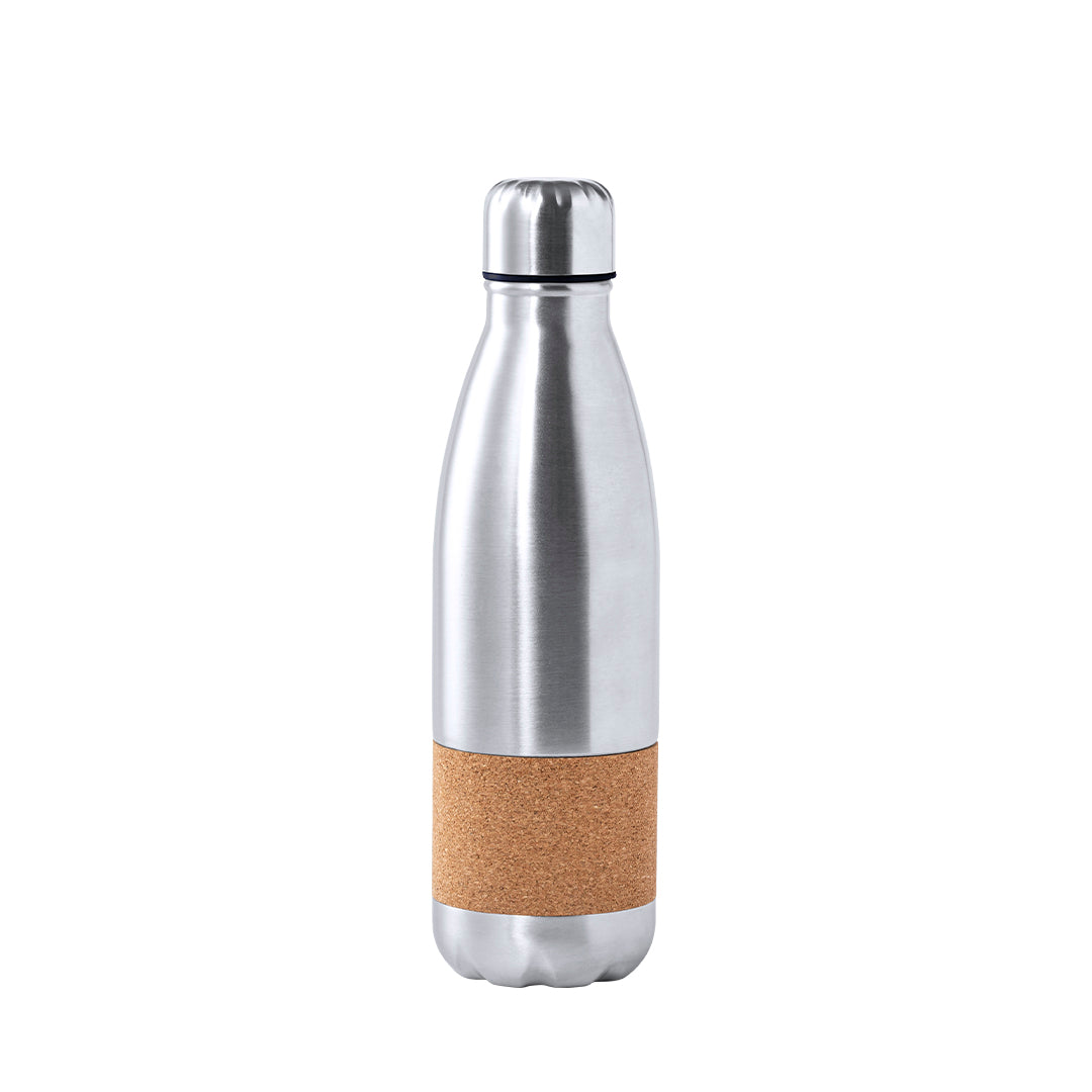 Bidón de línea nature, en combinación de materiales acero inox de acabado mate y corcho. 750ml de capacidad, con tapón de seguridad y presentado en atractiva caja de diseño eco.