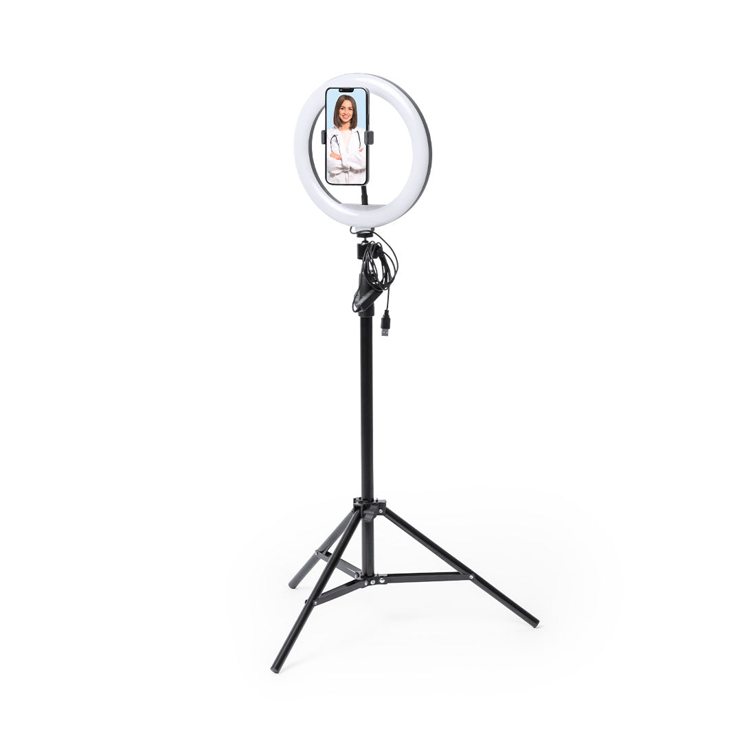 Set de iluminación. Incluye anillo de luz, trípode de mesa, y trípode de suelo con altura regulable hasta 180cm. 120 ledes, con 3 posiciones de iluminación y 10 niveles de intensidad de luz regulable. Alimentación mediante conexión USB. Cable con controlador y disparador remoto incluidos. Presentado en atractiva caja de diseño.