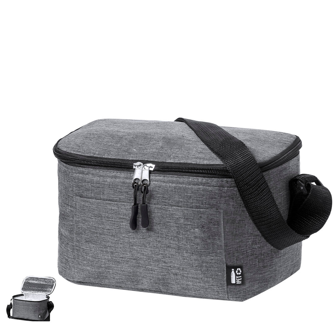 Nevera de línea nature y en resistente poliéster 600D RPET efecto melange, elaborado a partir de plástico reciclado para así fomentar la reutilización de residuos plásticos y contribuir a la sostenibilidad del planeta. Detalles en negro y base reforzada. Compartimento principal con cierre de cremallera e interior en aluminio. Incluye bolsillo exterior y cinta bandolera ajustable, con distintivo RPET en etiqueta exterior.
