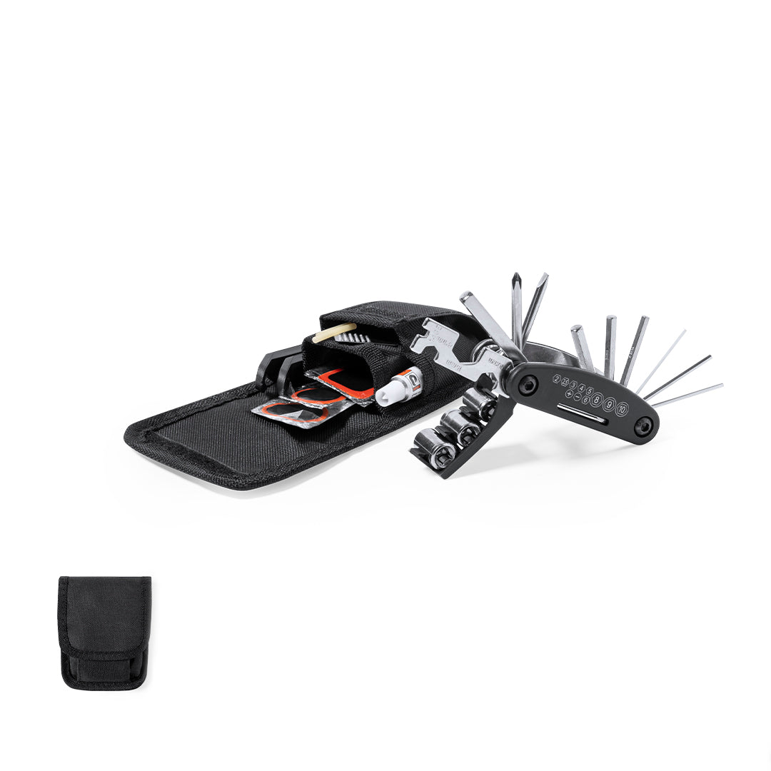 Completo kit de reparación para bici de 14 accesorios. Presentado en resistente estuche de poliéster 600D, con cierre de velcro. Incluye desmontadores de cubierta, multiherramienta y kit de reparación de pinchazos.