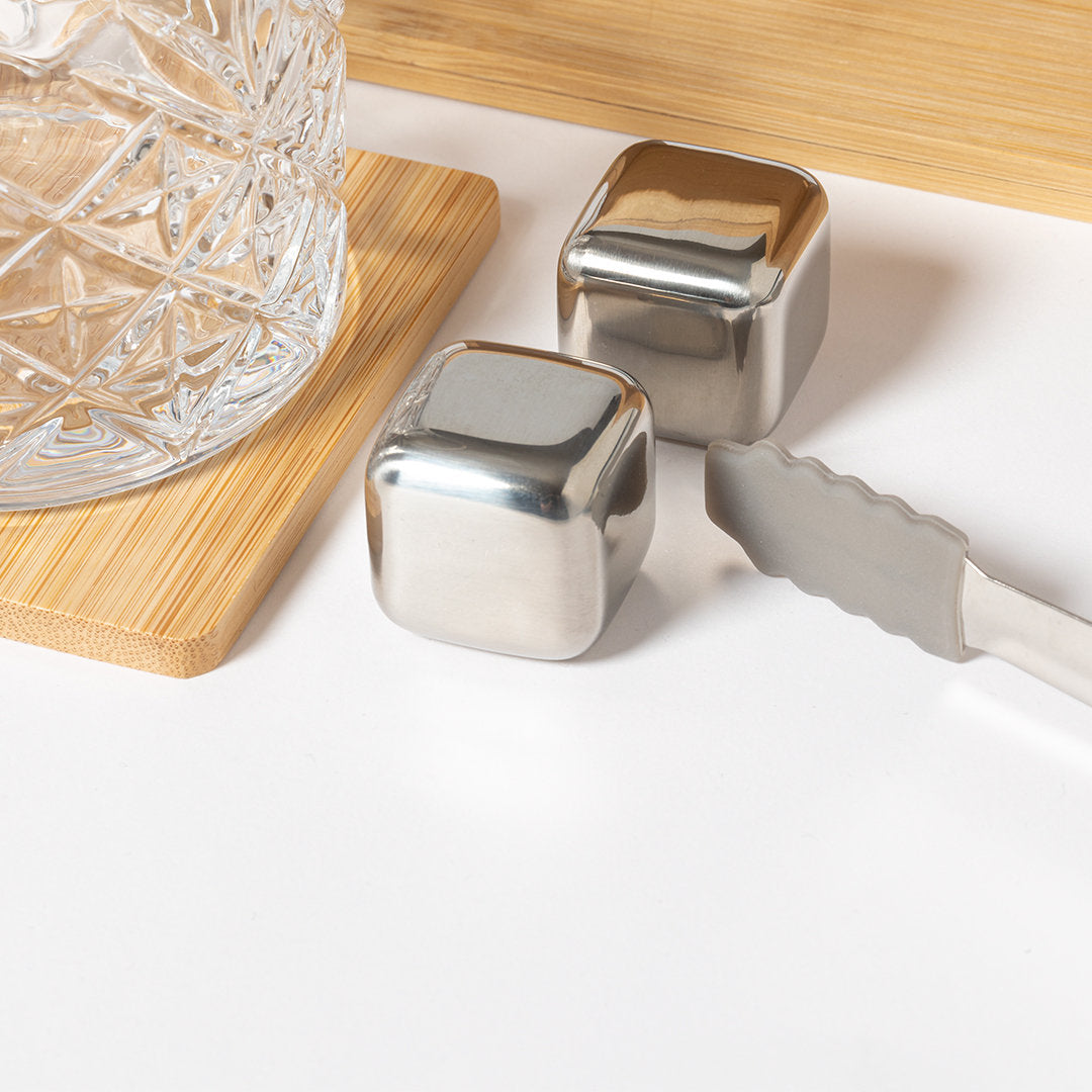 Set de whisky de alta calidad con elegante soporte en bambú. Incluye vaso de cristal de atractivo diseño y 350 ml de capacidad, 2 cubitos enfriadores reutilizables en acero inox, con pinzas juego y posavasos de bambú. Presentado en caja individual de diseño eco en cartón kraft.
