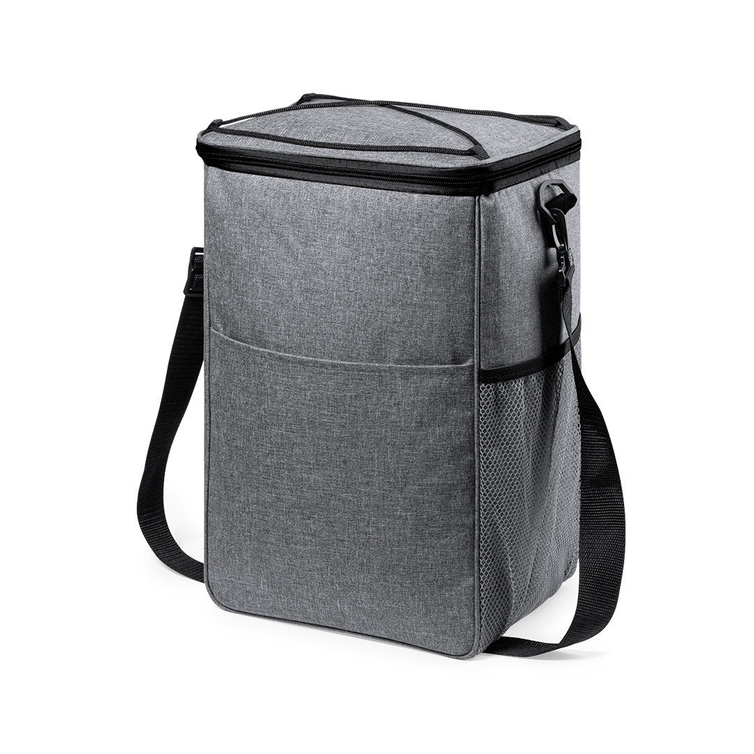 Set de barbacoa con 3 accesorios. Incluye: Bolsa de transporte/nevera fabricada en resistente poliéster RPET 300D, elaborado a partir de plástico reciclado, para así fomentar la reutilización de residuos plásticos y ayudar a la sostenibilidad del planeta. Con cinta para hombro ajustable de cierre de mosquetón e interior isotermo en PEVA, para conservar la temperatura de los alimentos. Distintivo RPET en etiqueta etiqueta exterior. Paleta, pinzas y trinchador metálicos, con mangos en color negro.