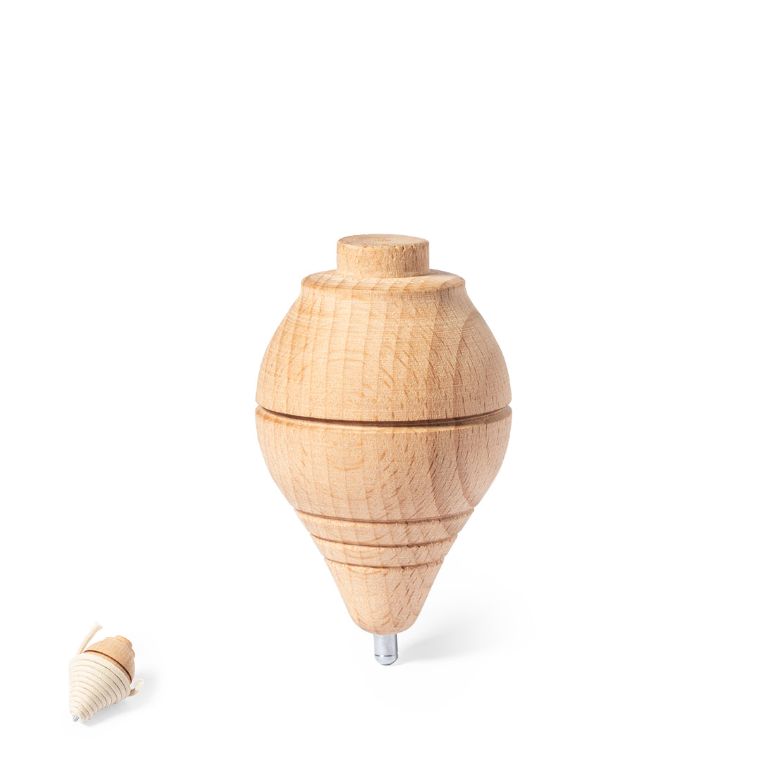 Peonza fabricada en resistente madera maciza, con cuerda en algodón de 120 cm de largo.
