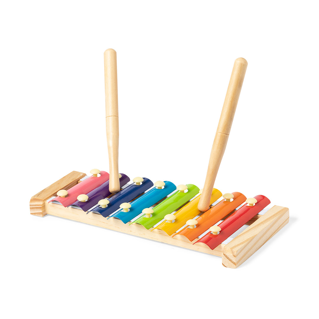 Xilófono con base y baquetas en madera natural de pino. Teclas metálicas multicolor y presentado en caja individual de diseño kraft.