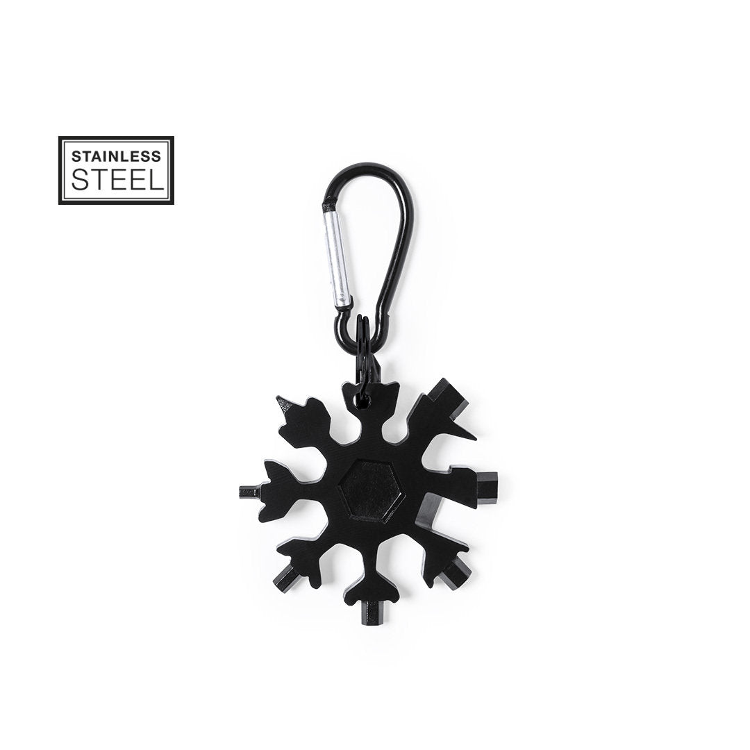 Original y práctica multiherramienta fabricada en resistente acero inox de acabado negro, con anilla y mosquetón de transporte a juego. Con 17 funciones, entre otras, destornillador puntas planas y philips llaves hexagonales tipo allen cuchillo y abrebotellas. Presentada en caja individual negra.