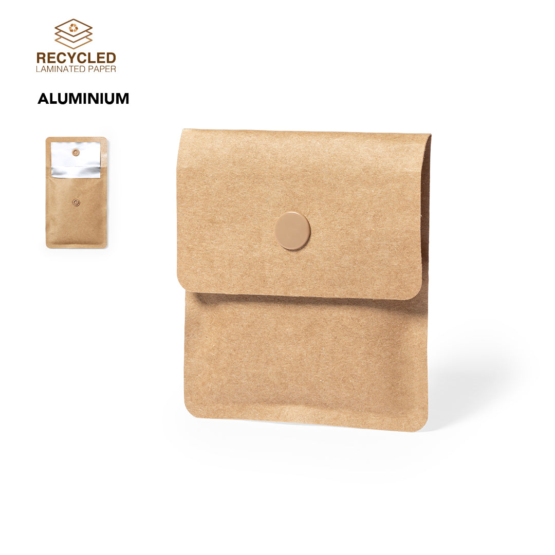 Cenicero de bolsillo de línea nature, con exterior en papel reciclado laminado e interior en aluminio ignífugo. Solapa con cierre de corchete a juego.