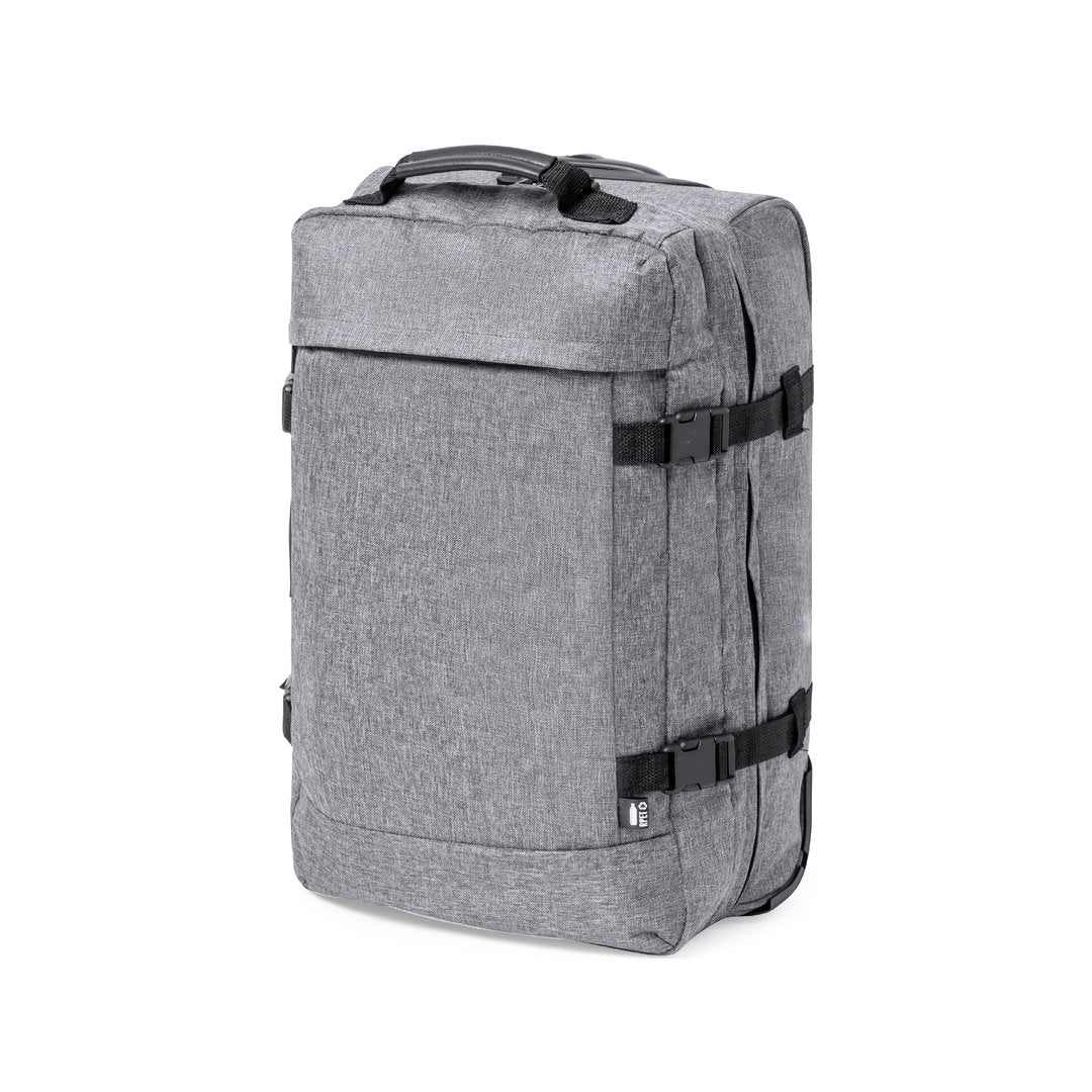 Trolley de línea nature fabricado en resistente 300D RPET. Compartimento principal con cierre de cremallera de doble tirador conforme a los estándares TSA -Administración de la Seguridad en el Transporte-, que permite a las autoridades de aduanas inspeccionar el contenido del equipaje sin tener que forzar o romper el cierre, usando una llave especial a disposición de la autoridad. Interior forrado y con cintas elásticas de sujeción. Exterior con 2 cintas ajustables, cierres de hebilla, bolsillo frontal con cierre de cremallera invisible y 2 asas acolchadas de transporte. Mecanismo extensible metálico en negro, con cómoda asa de transporte y 2 ruedas. Distintivo RPET en etiqueta exterior.