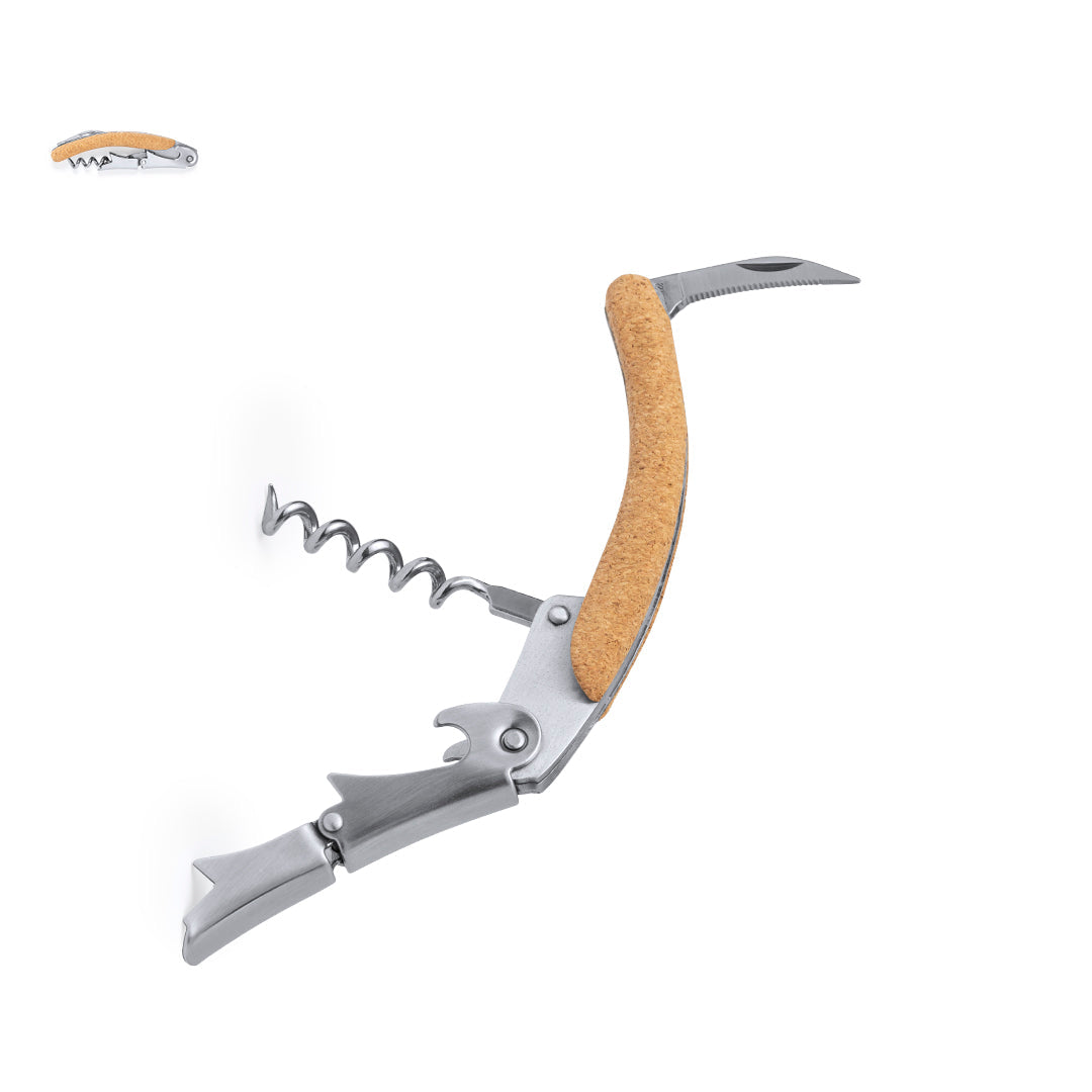 Sacacorchos de 2 tiempos fabricado en acero inox, con mango en corcho natural y cortacápsulas integrado. Presentado en caja individual de diseño kraft.