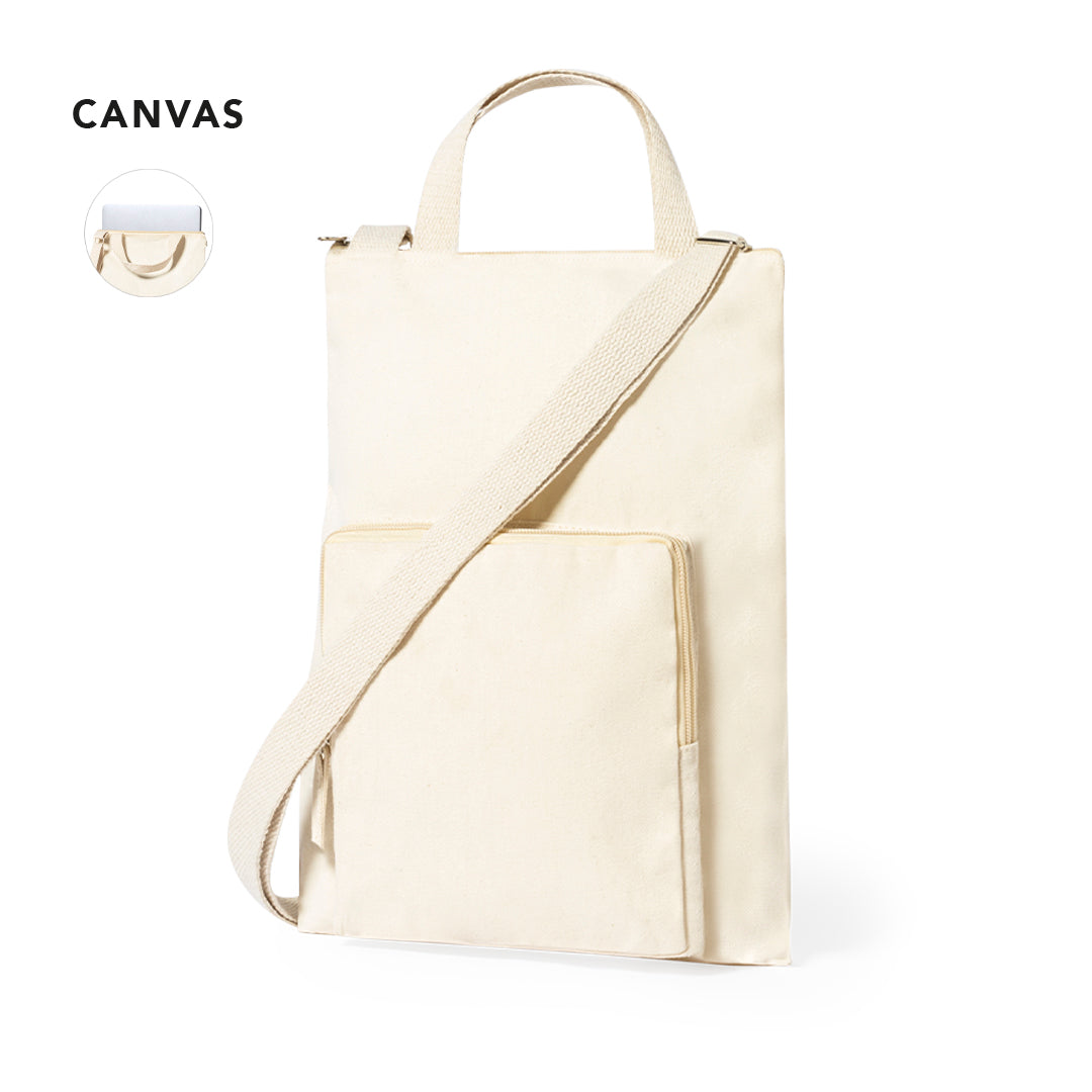 Original funda para ordenador portátil, fabricada en resistente canvas de acabado natural. Compartimento principal con cierre de cremallera a juego y asa de transporte. Con cinta bandolera ajustable a juego y bolsillo exterior con cierre de cremallera. Para ordenador portátil o tablet de hasta 15 pulgadas. El canvas es un tejido muy versátil y duradero, compuesto en su mayor medida de algodón. Contribuye al cuidado del medio ambiente, ya que gracias a su resistencia ofrece una gran capacidad de reutilización.