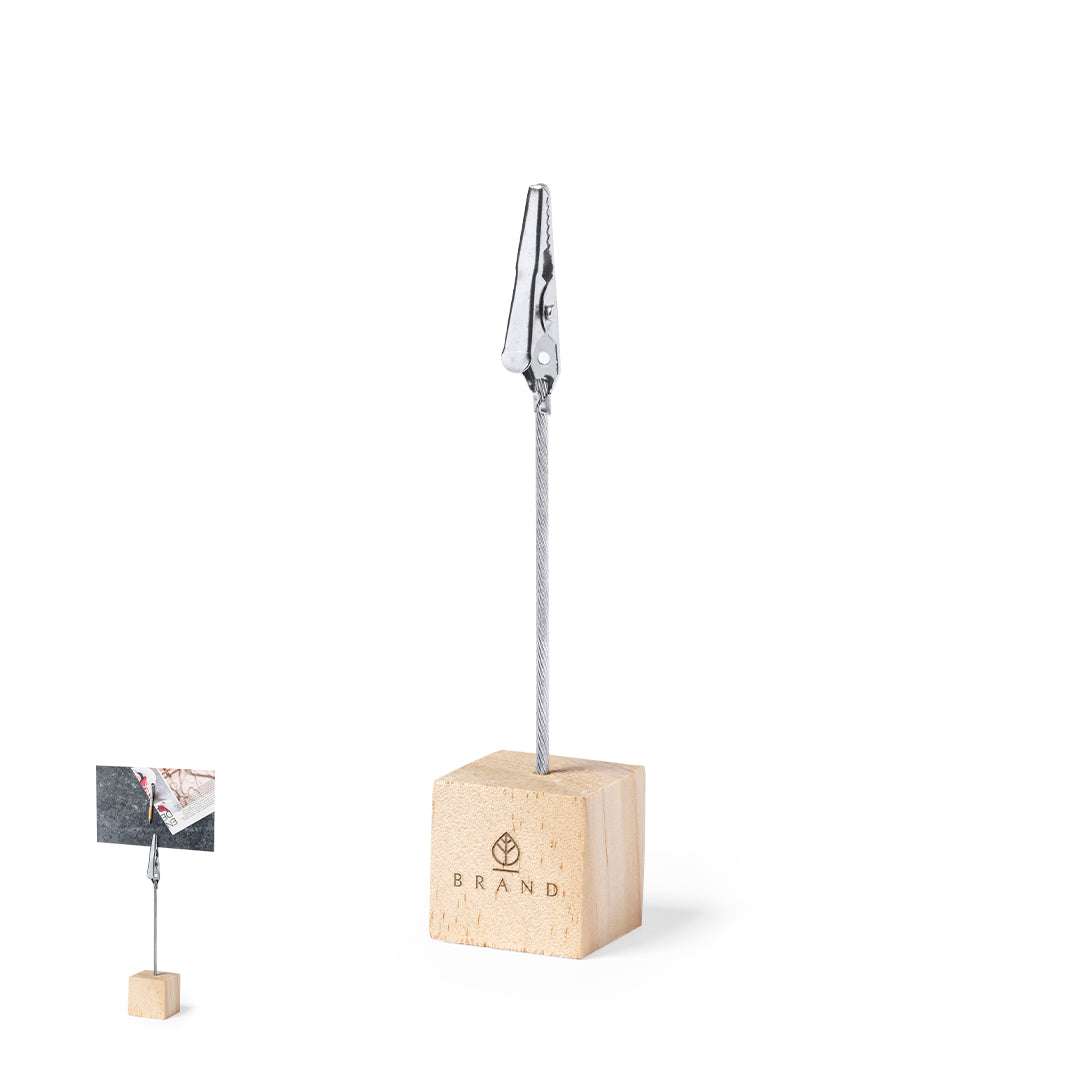 Clip de línea nature, con resistente base fabricada en madera de pino natural. Con poste y pinza metálicos para una firme sujeción de tarjetas, notas, fotos…