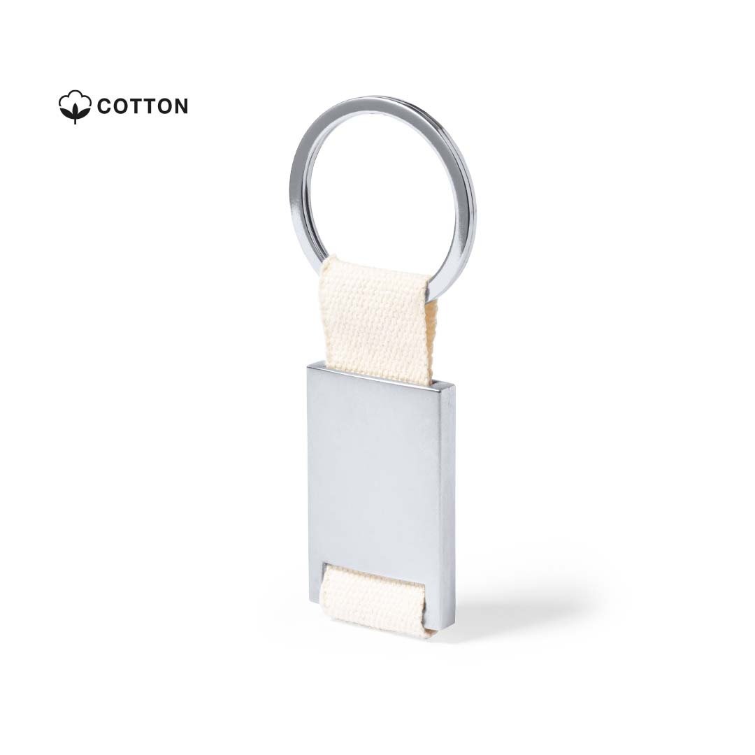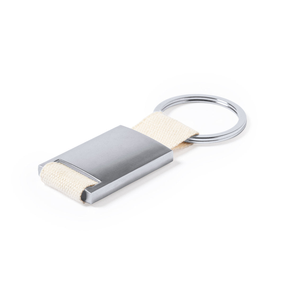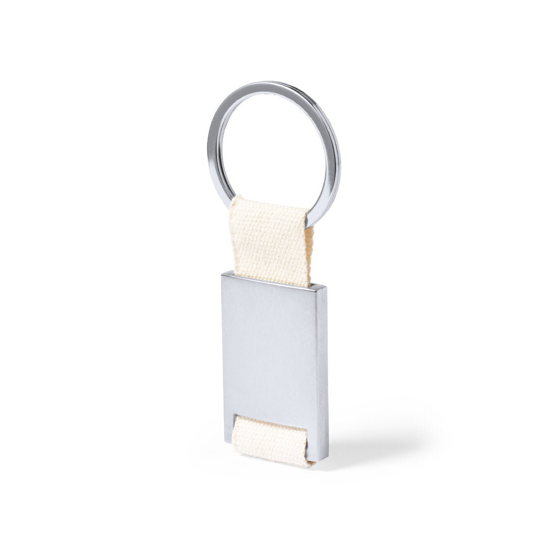 Llavero con cuerpo metálico de acabado plateado. Cinta 100% algodón de acabado natural. Amplia superficie de marcaje y anilla llavero metálica a juego. Presentado en bolsa individual con cartón interior kraft.