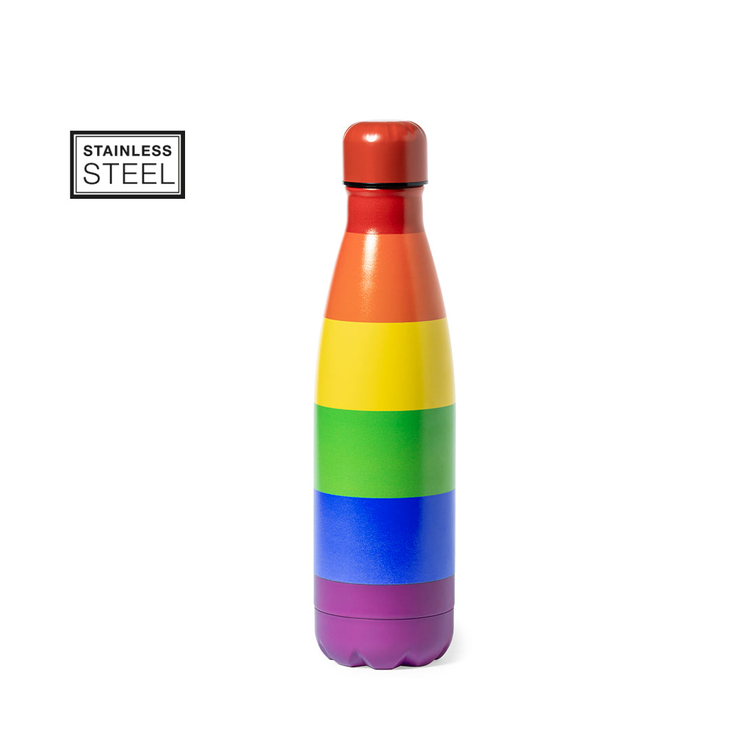 Bidón Rainbow de 790 ml de capacidad, fabricado en acero inox multicolor. Todo un orgullo de bidón, con tapón a rosca y libre de BPA. Presentado en caja individual de diseño kraft.