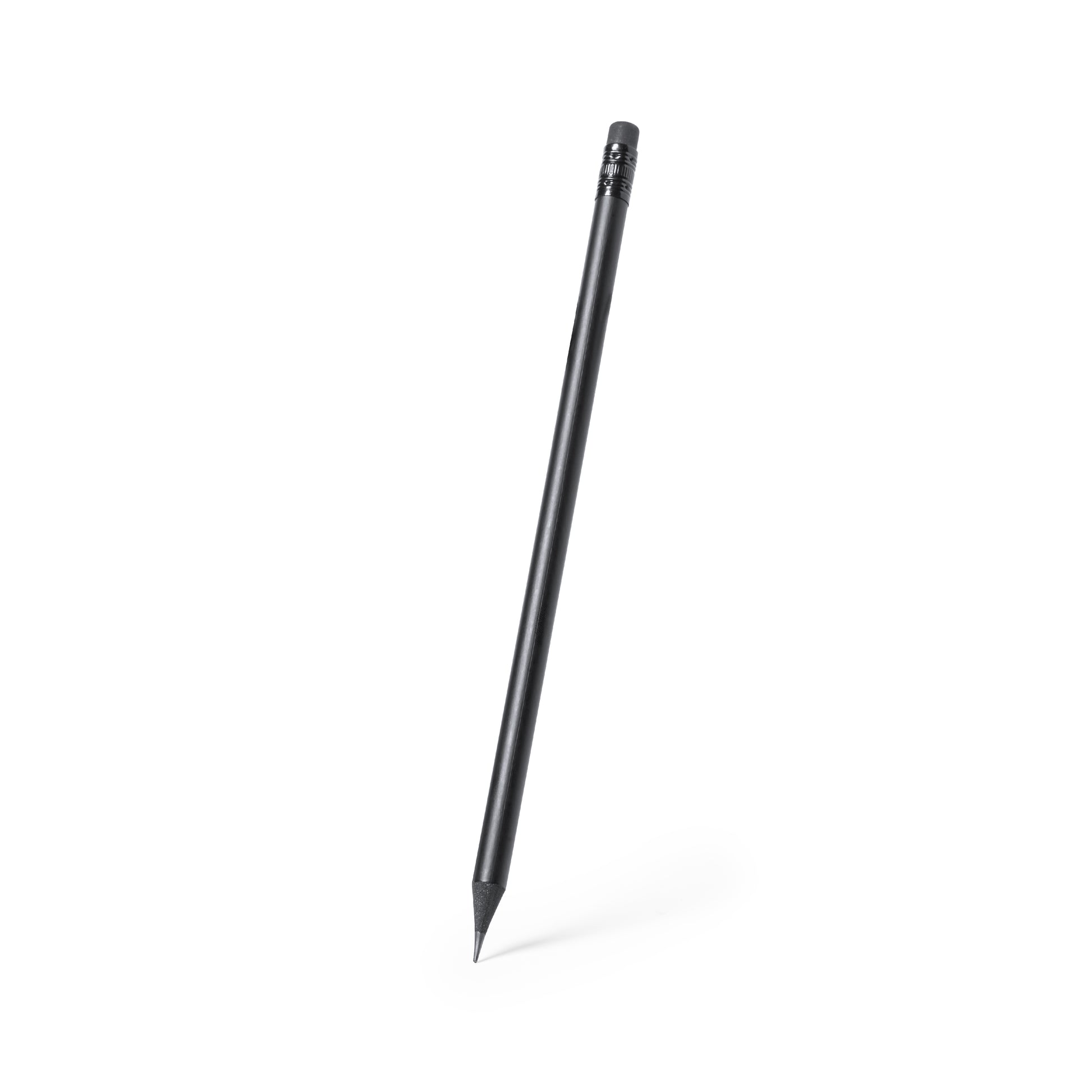 Lápiz de madera natural en acabado negro mate. Con goma de borrar, mina negra y punta afilada.