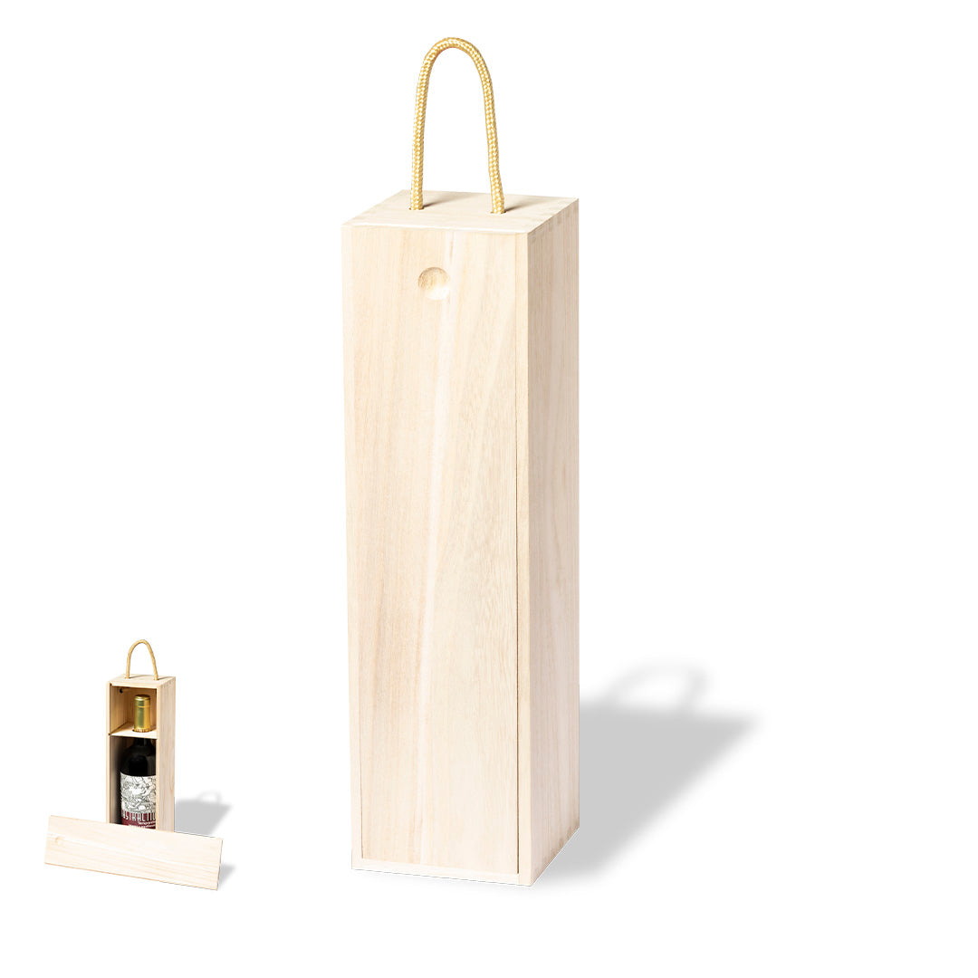 Caja de presentación premium para 1 botella, fabricada en madera natural de Paulownia, ligera y resistente. Interior con sujeción de seguridad para el cuello de la botella, con tapa deslizante y cordón de transporte.