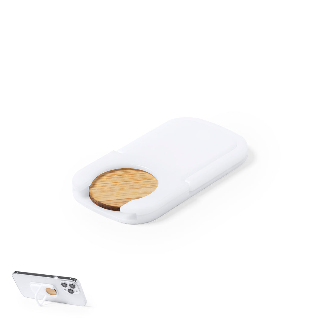 Soporte multifunción para smartphone, con moneda para carro de la compra integrada y anilla/soporte plegable. Cuerpo fabricado en resistente ABS de acabado blanco, con moneda en bambú. Con adhesivo de fijación extra fuerte y libre de residuos al despegarlo del dispositivo.