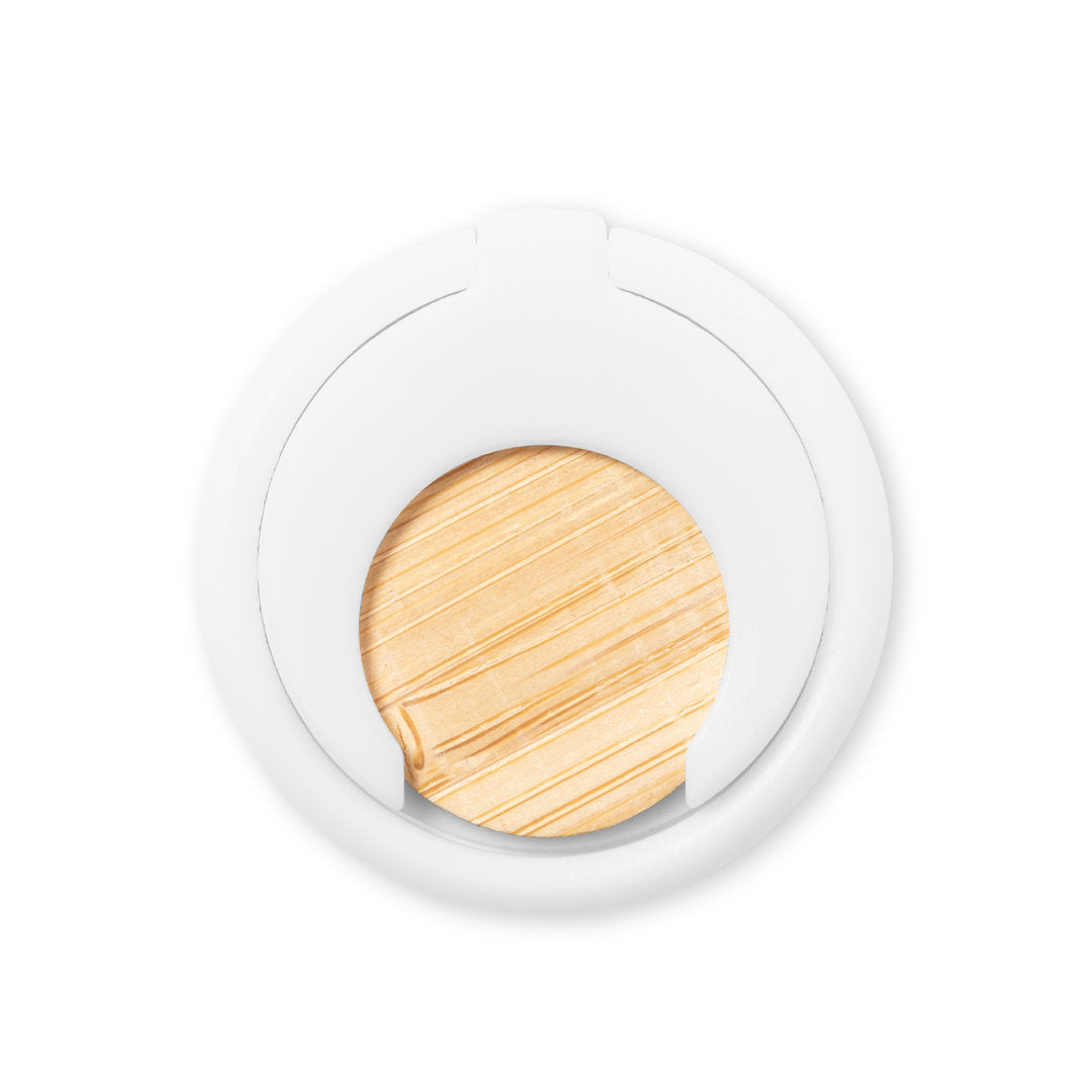 Soporte multifunción para smartphone, con moneda para carro de la compra integrada y anilla/soporte plegable. Cuerpo fabricado en resistente ABS de acabado blanco, con moneda en bambú. Con adhesivo de fijación extra fuerte y libre de residuos al despegarlo del dispositivo.