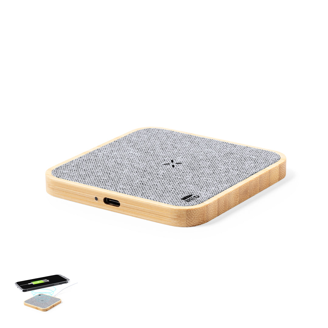 Cargador inalámbrico 15W de diseño rectangular. Fabricado en bambú y poliéster RPET, elaborado a partir de plástico reciclado, para así fomentar la reutilización de residuos plásticos y ayudar a la sostenibilidad del planeta. Compatible con dispositivos equipados con tecnología de carga inalámbrica Qi. Incluye cable cargador Tipo C y manual de instrucciones en español e inglés. Con distintivo RPET y presentado en caja individual de diseño kraft.Fabricado conforme a los estándares RoHS y en cumplimiento con los siguientes requisitos de seguridad:Sistema de protección contra sobrecalentamiento.Sistema de protección contra sobrecarga.Sistema de bloqueo para evitar cortocircuitos.
