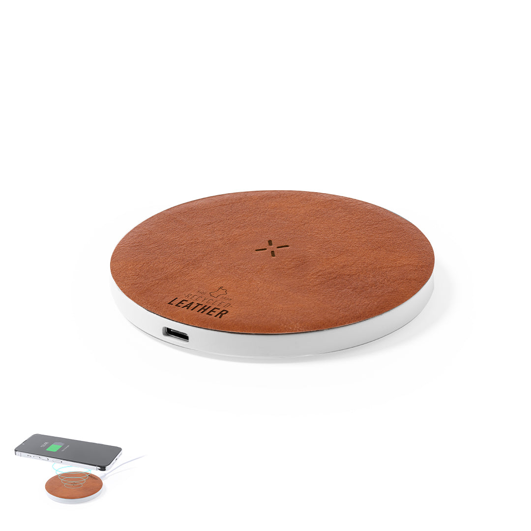 Cargador inalámbrico 15W, fabricado en combinación de RABS y cuero reciclado. Compatible con dispositivos equipados con tecnología de carga inalámbrica Qi. Con base antideslizante, incluye cable cargador Tipo C y manual de instrucciones en español e inglés. Presentado en caja individual de diseño kraft. El material RABS o ABS Reciclado y el cuero reciclado proceden del reciclado de artículos al final de su vida útil. Los materiales reciclados empleados incorporan la certificación RCS que garantiza el origen reciclado de los mismos. Fabricado conforme a los estándares RoHS y en cumplimiento con los siguientes requisitos de seguridad: Sistema de protección contra sobrecalentamiento. Sistema de protección contra sobrecarga. Sistema de bloqueo para evitar cortocircuitos.