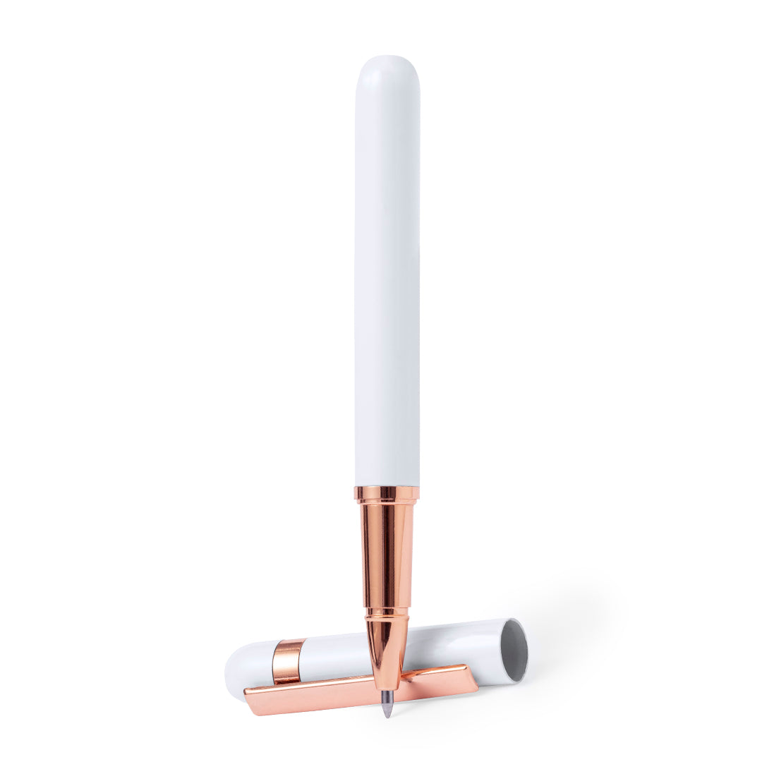Elegante roller especialmente diseñado para el marcaje en láser con logotipo en color rosado. Con clip metálico y detalles plásticos en acabado rosado. Con cartucho jumbo, en tinta azul y cierre con capucha. Disponible en dos distintivos colores.Presentado en elegante caja de diseño negra.