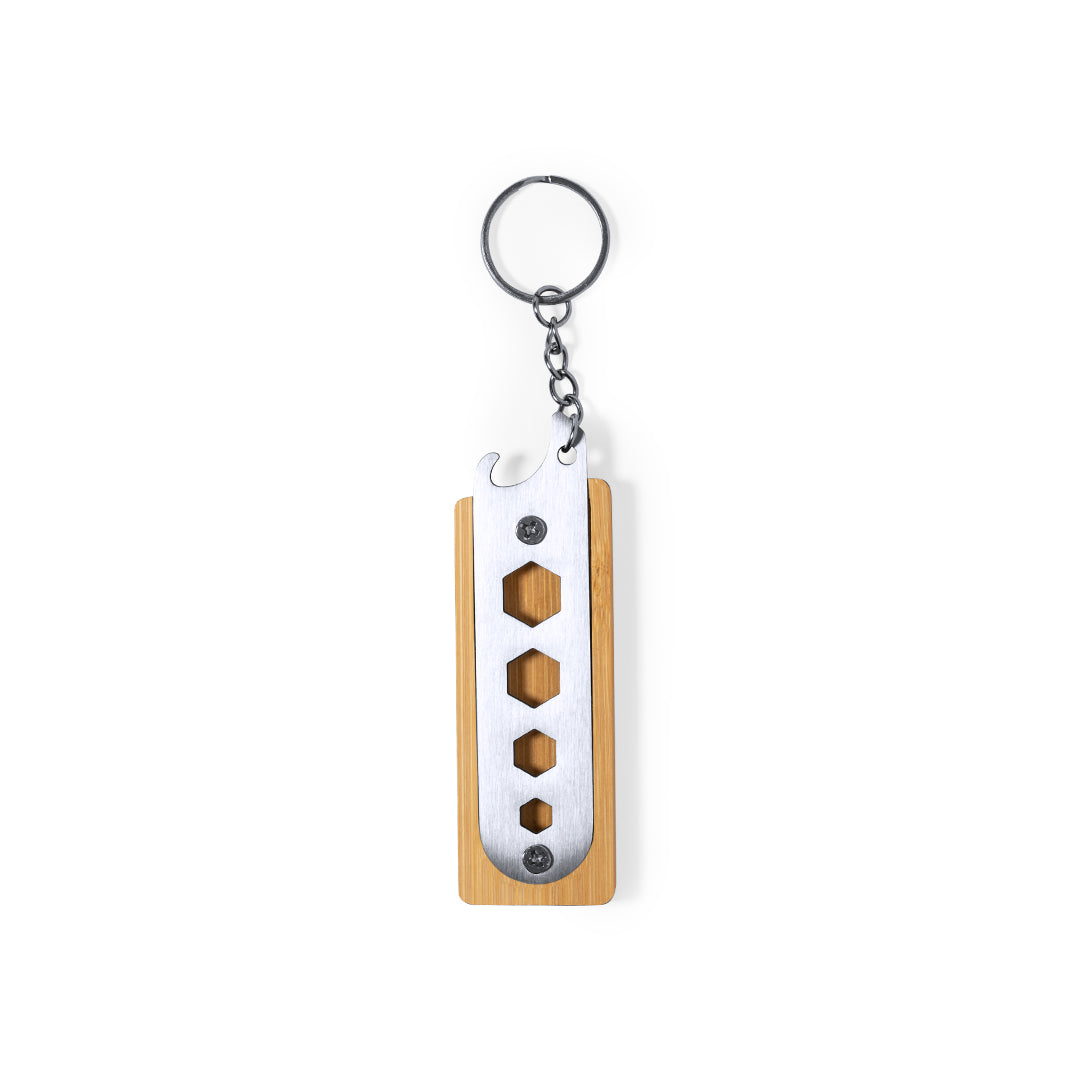 Llavero multiherramienta fabricado en resistente acero inox y bambú. Con práctico conjunto de 4 llaves fijas hexagonales troqueladas y abrebotellas. Presentado en caja individual de diseño kraft.