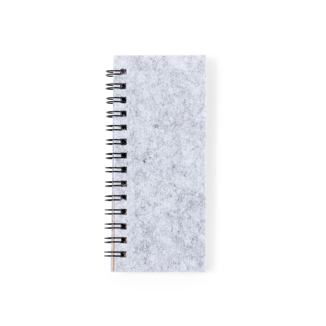 Bloc de notas fabricado en suave fieltro RPET. Con distintivo RPET en portada. Incluye:Bloc de anillas de 30 hojas blancas con disposición a una raya y distintivo reciclado por ambas caras.25 notas adhesivas medianas.125 mininotas adhesivas en varios colores.Presentado en bolsa individual reciclada.