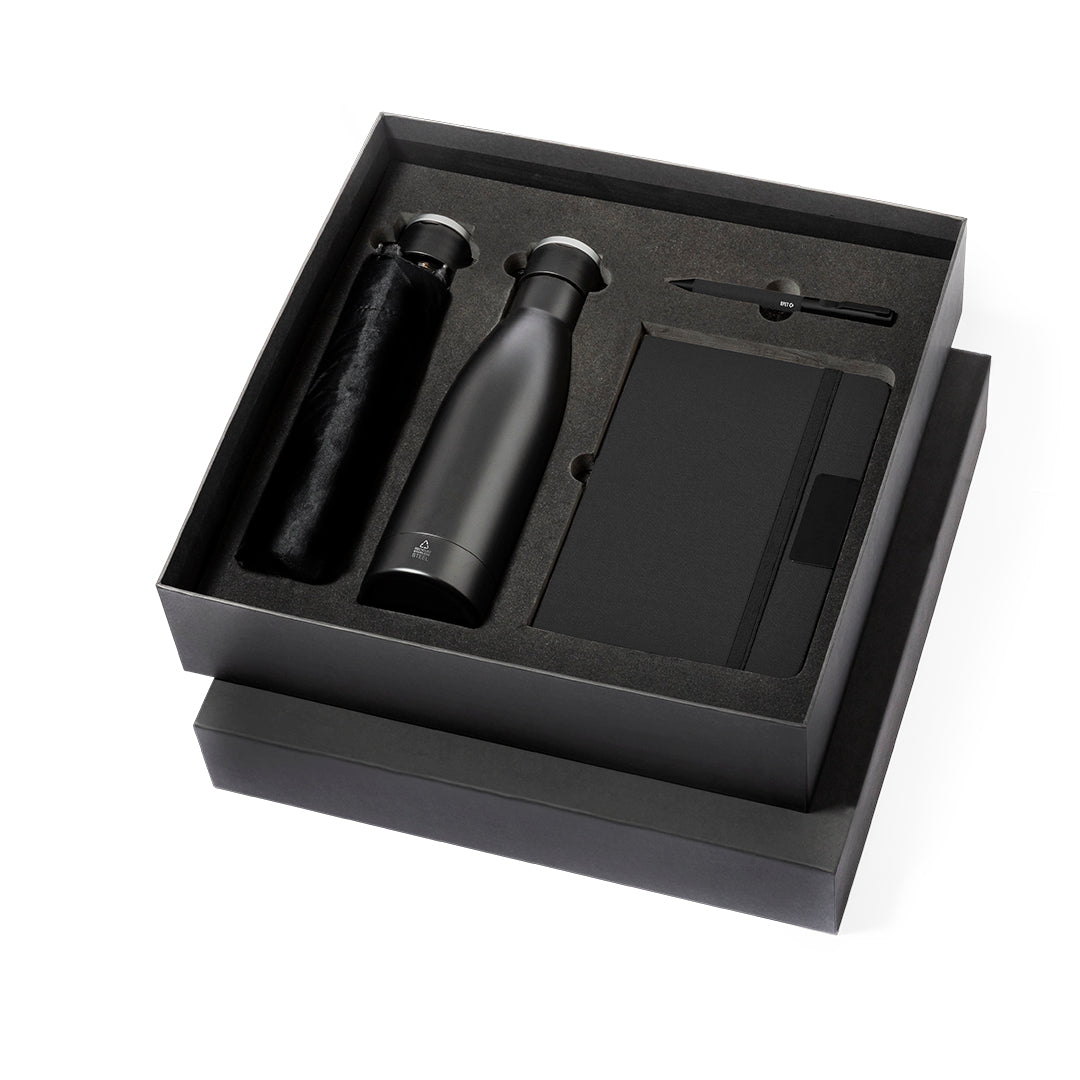 Elegante set premium que incluye:Termo de doble capa en acero inoxidable reciclado de acabado negro mate y de 500 ml de capacidad, con asa rígida de metal color plata mate. Con distintivo acero inoxidableBloc de notas en RPET en elegante color negro, con detalle metálico especial para marcaje en láser. Incluye cierre elástico y marcapáginas de tela. Interior con 80 hojas de disposición a una raya. Con distintivo RPETParaguas plegable de color negro con 98cm de diámetro. En material pongee 190T RPET. De apertura manual, con sistema anti viento y varillas fibra de vidrio. Con funda de transporte y cintas a juego. Con etiqueta distintiva RPET.Bolígrafo en RPET de acabado negro mate, de mecanismo giratorio y tinta azul. El material RPET se elabora a partir de plástico reciclado, para así fomentar la reutilización de residuos plásticos y ayudar a la sostenibilidad del planeta. Set presentado en estuche individual de acabado mate, con troquelado interior para cada uno de los elementos del set.