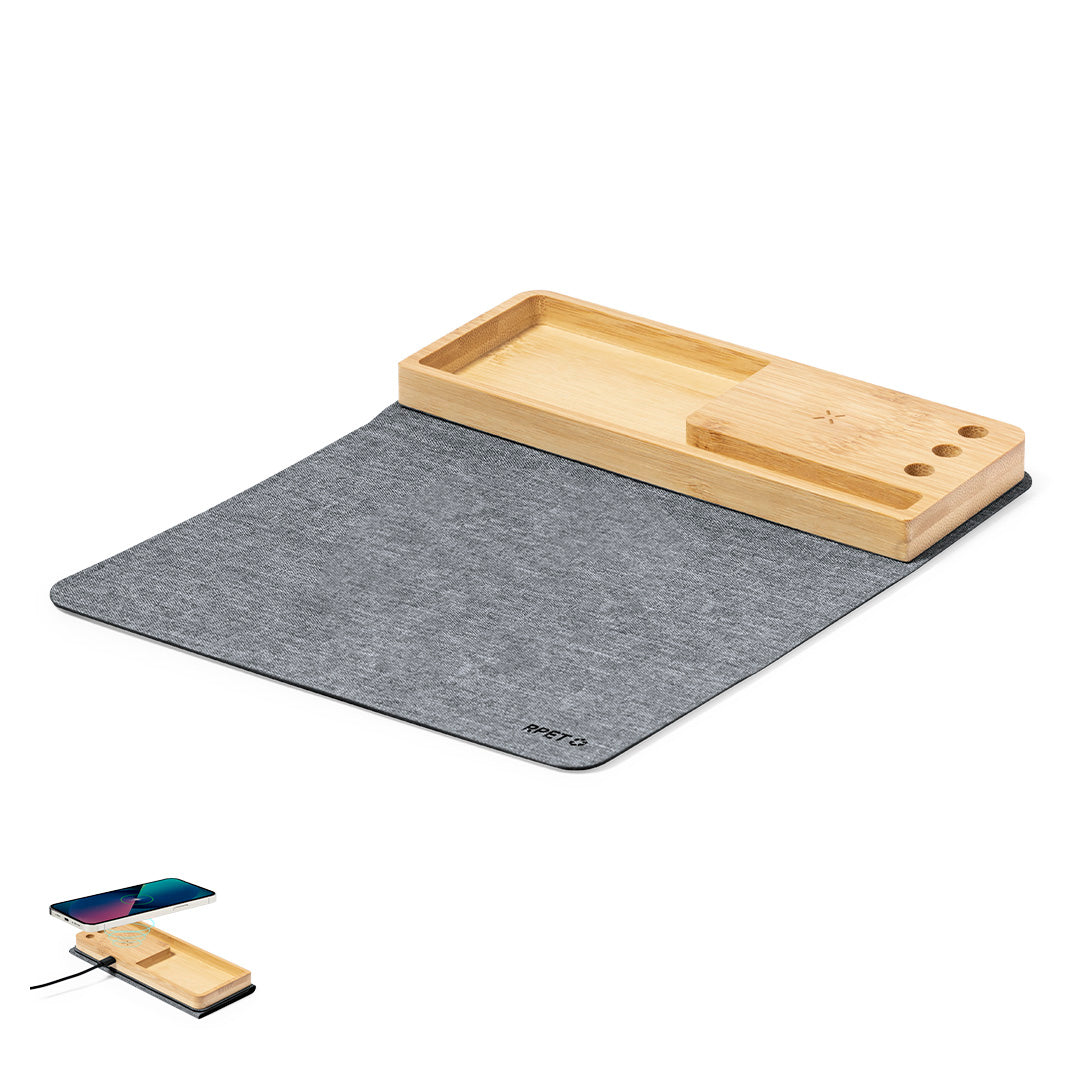 Elegante y funcional alfombrilla plegable fabricada en combinación de suave poliéster RPET y bambú. Con entrada tipo C -cable negro Tipo C incluido- y cargador inalámbrico de 15W,compatible con dispositivos equipados con tecnología de carga inalámbrica Qi. Incluye soporte para smartphone, soporte para bolígrafos, y compartimento libre de almacenaje en bambú. Base antideslizante que garantiza un uso cómodo y estable.Incluye manual de uso en en español e inglés. Presentada en caja individual de diseño kraft y en bolsa reciclada.El material RPET se elabora a partir de plástico reciclado, para así fomentar la reutilización de residuos plásticos y ayudar a la sostenibilidad del planeta.En cumplimiento con los requisitos de seguridad: Sistema de protección contra sobrecalentamiento. Sistema de protección contra sobrecarga. Sistema de bloqueo para evitar cortocircuitos.