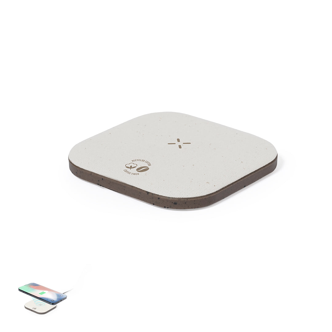 Cargador inalámbrico fabricado en fibra de café y algodón reciclado. Base antideslizante y compatible con dispositivos equipados con tecnología de carga Qi. Capacidad de carga de 15W, con cable negro Tipo C incluido. Con distintivos de fibra de café y algodón reciclado. Presentado en atractiva caja de diseño kraft, con manual de instrucciones en español e inglés.La fibra de café es una solución circular que se obtiene de la utilización de los residuos producidos en la obtención del café. Una alternativa sostenible que favorece la reducción del uso de plásticos, ahorrando energía en su proceso de fabricación y contribuyendo al cuidado del medio ambiente.Disponible certificación GRS (Global Recycled Standard / Estándar de Reciclaje Global), que garantiza el origen reciclado del material usado para fabricar el producto.