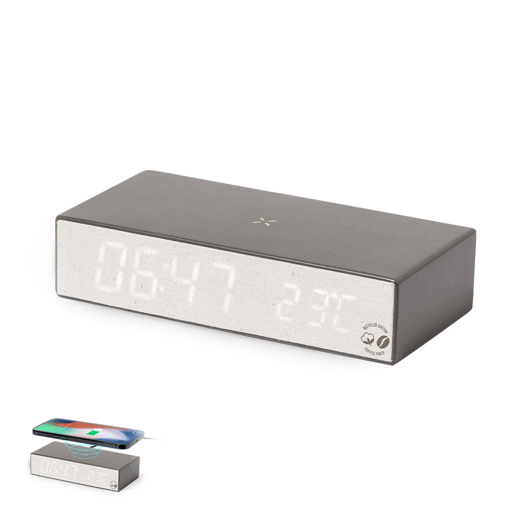 Reloj multifunción con cargador inalámbrico 10W integrado. Fabricado en en fibra de café y algodón reciclado. Función hora (12/24h), alarma, con intensidad de luz regulable. Alimentación mediante conexión USB. Compatible con dispositivos equipados con tecnología de carga inalámbrica y presentado en atractiva caja de diseño kraft. Con distintivo de fibra de café y algodón reciclado. Incluye manual de instruccions en español e inglés.La fibra de café es una solución circular que se obtiene de la utilización de los residuos producidos en la obtención del café. Una alternativa sostenible que favorece la reducción del uso de plásticos, ahorrando energía en su proceso de fabricación y contribuyendo al cuidado del medio ambiente.Disponible certificación GRS (Global Recycled Standard / Estándar de Reciclaje Global), que garantiza el origen reciclado del material usado para fabricar el producto.