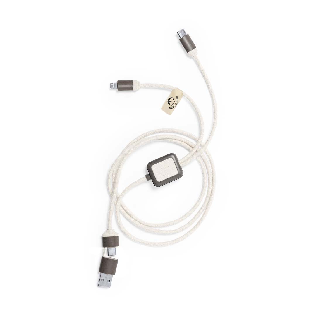Cable cargador fabricado en fibra de café, con cables recubiertos en algodón reciclado. Conexiones de entrada Tipo C y USB, con salidas Tipo C, Lightning y Micro USB. 5V DC 2.4A. Con distintivos de fibra de café y algodón reciclado. Presentado en bolsa individual de diseño kraft con autocierre.La fibra de café es una solución circular que se obtiene de la utilización de los residuos producidos en la obtención del café. Una alternativa sostenible que favorece la reducción del uso de plásticos, ahorrando energía en su proceso de fabricación y contribuyendo al cuidado del medio ambiente. Disponible certificación GRS (Global Recycled Standard / Estándar de Reciclaje Global), que garantiza el origen reciclado del material usado para fabricar el producto.