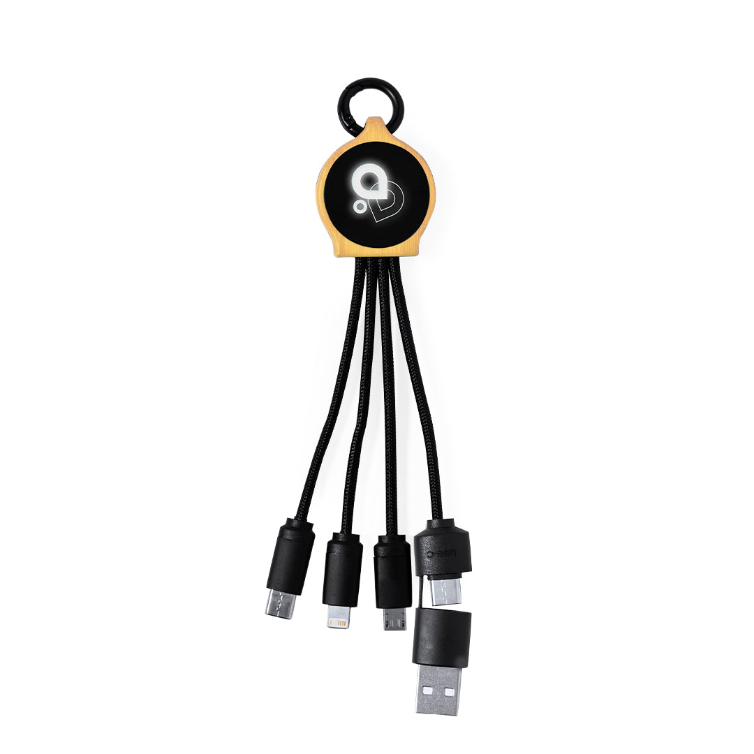 Cable cargador fabricado en bambú y superficie en elegante color negro, con luz led interior y un recubrimiento exterior especialmente diseñado para marcaje en láser, iluminando así el logotipo. Con conexiones de entrada Tipo C y USB y salidas Tipo C, Lightning y Micro USB. 5V DC 2.4A. Presentado en bolsa individual de diseño kraft.