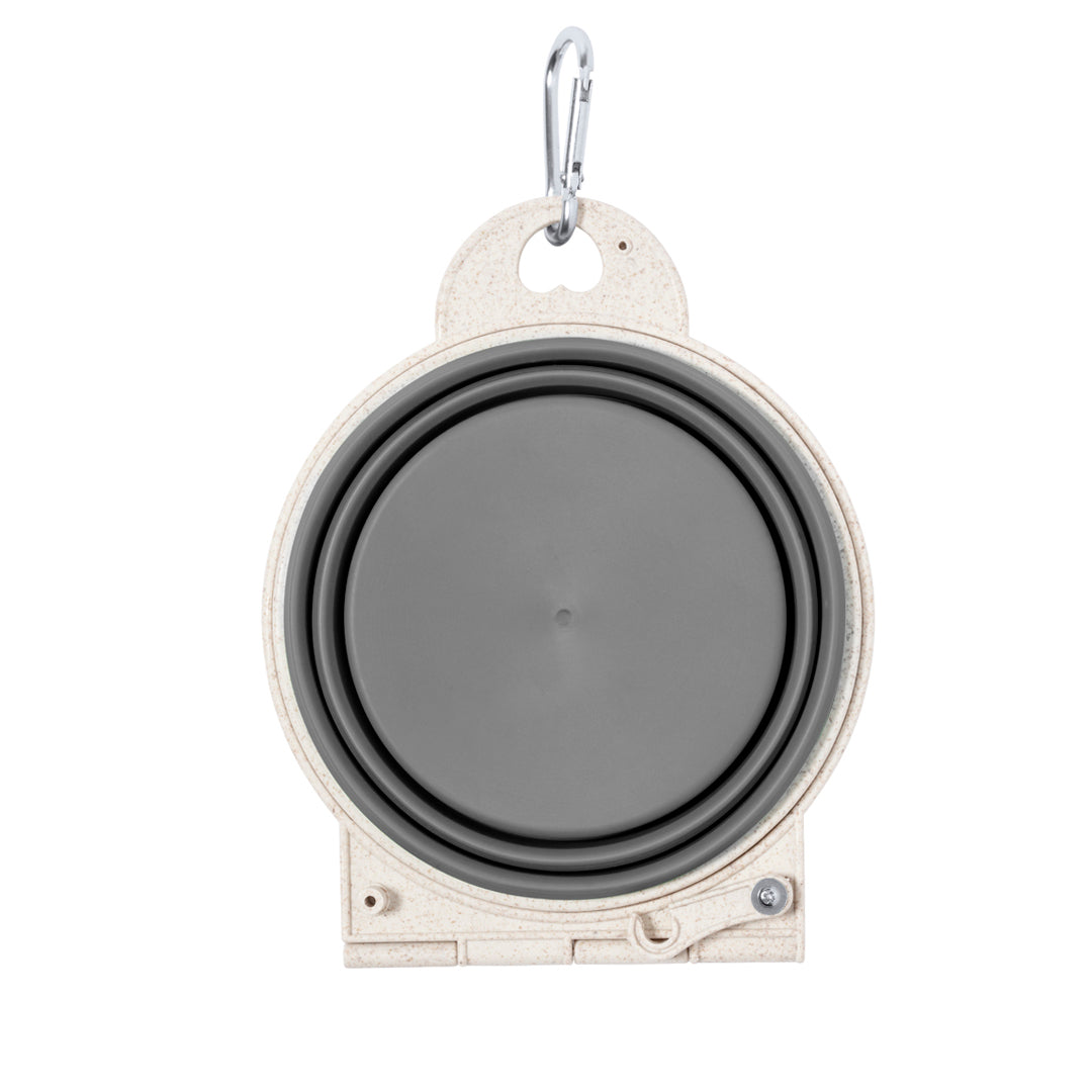 Bowl plegable para mascotas fabricado en caña de trigo. De diseño compacto, con dos compartimentos y perfecto para usar en cualquier sitio. Incluye práctico mosquetón de transporte de fácil enganche. Presentado en una bolsa individual reciclada.La caña de trigo fomenta la utilización de materias primas naturales, reduciendo así las emisiones contaminantes.