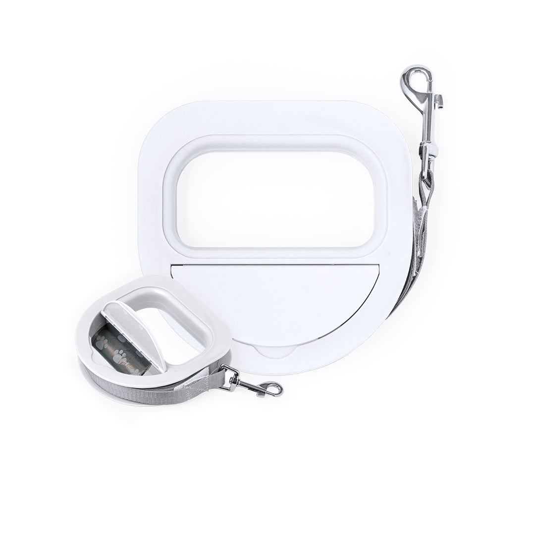 Cinta de paseo de 3 metros, fabricada en resistente poliéster, con carcasa en robusto ABS. Cómoda empuñadura ergonómica y práctico compartimento con tapadera para almacenar las bolsas. Incluye mosquetón metálico de enganche giratorio y viene presentada individualmente en caja de diseño kraft.