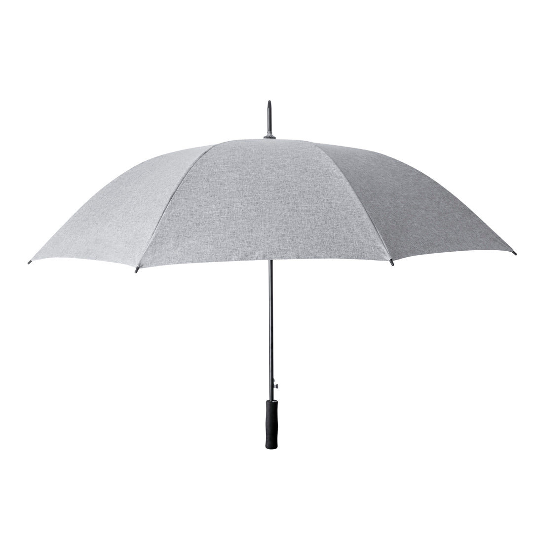 Paraguas de alta calidad y 130cm de diámetro, fabricado en material poliéster 150D y en elegante tono gris jaspeado. Apertura automática, varillas de fibra de vidrio antiviento y cierre de velcro. Mango recto fabricado en EVA. Presentado en bolsa reciclada.