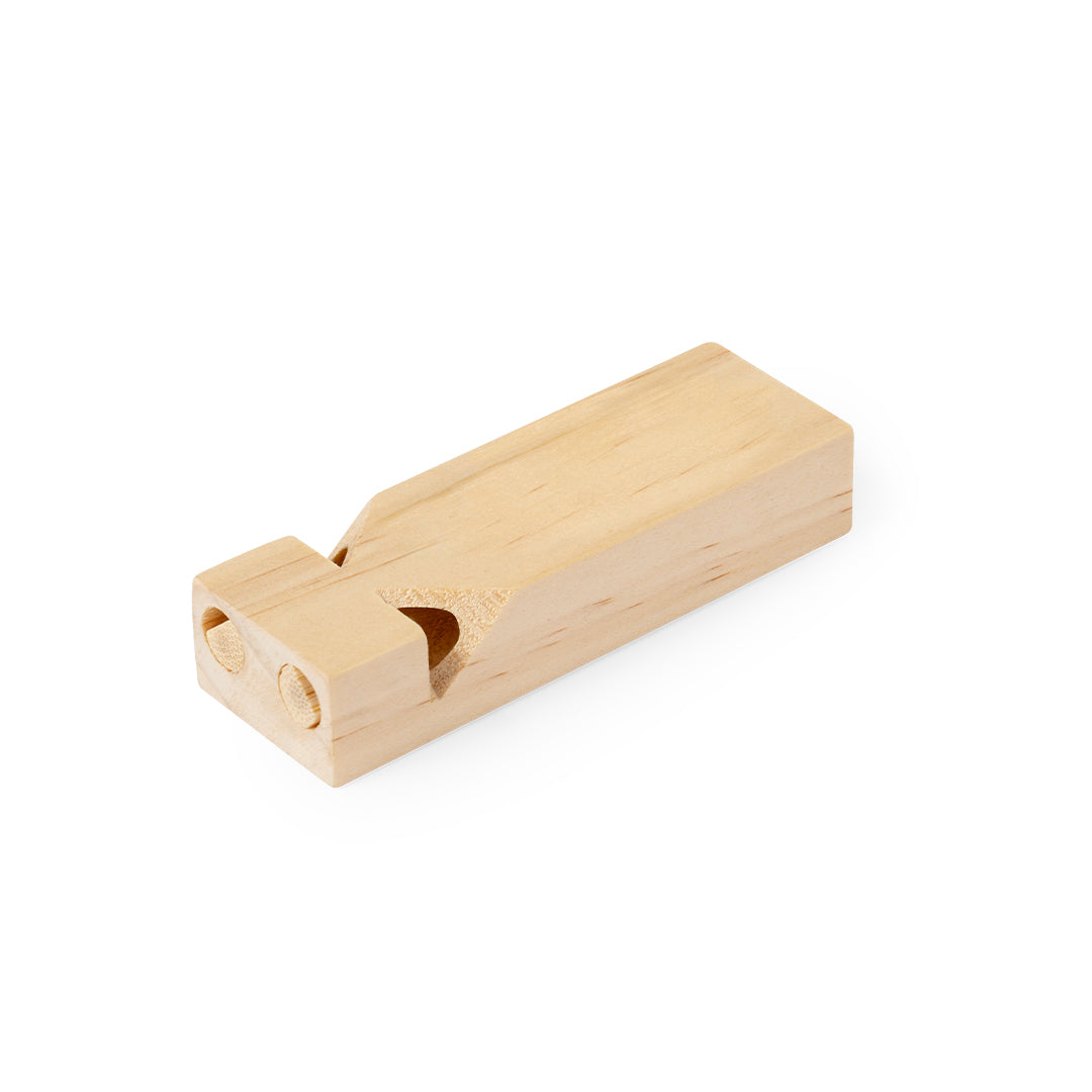 Divertido silbato con dos modalidades de sonido distintas. Fabricado en suave madera, de diseño artesanal con un toque natural. Presentado individualmente en bolsa reciclada.