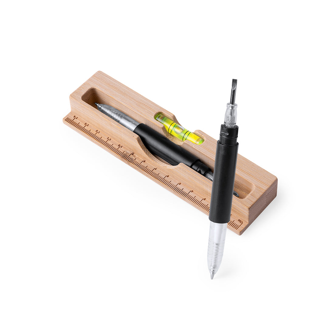 Práctica multiherramienta de 5 funciones, fabricada en resistente acero al carbono y acabado en color negro. Con funciones destornillador (punta plana y philips) y bolígrafo con tinta azul (cartucho jumbo). Presentada en resistente estuche de bambú, con nivel integrado y regla. Presentada individualmente en caja de diseño kraft.
