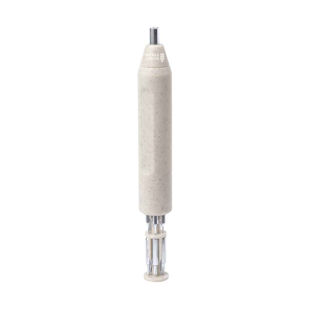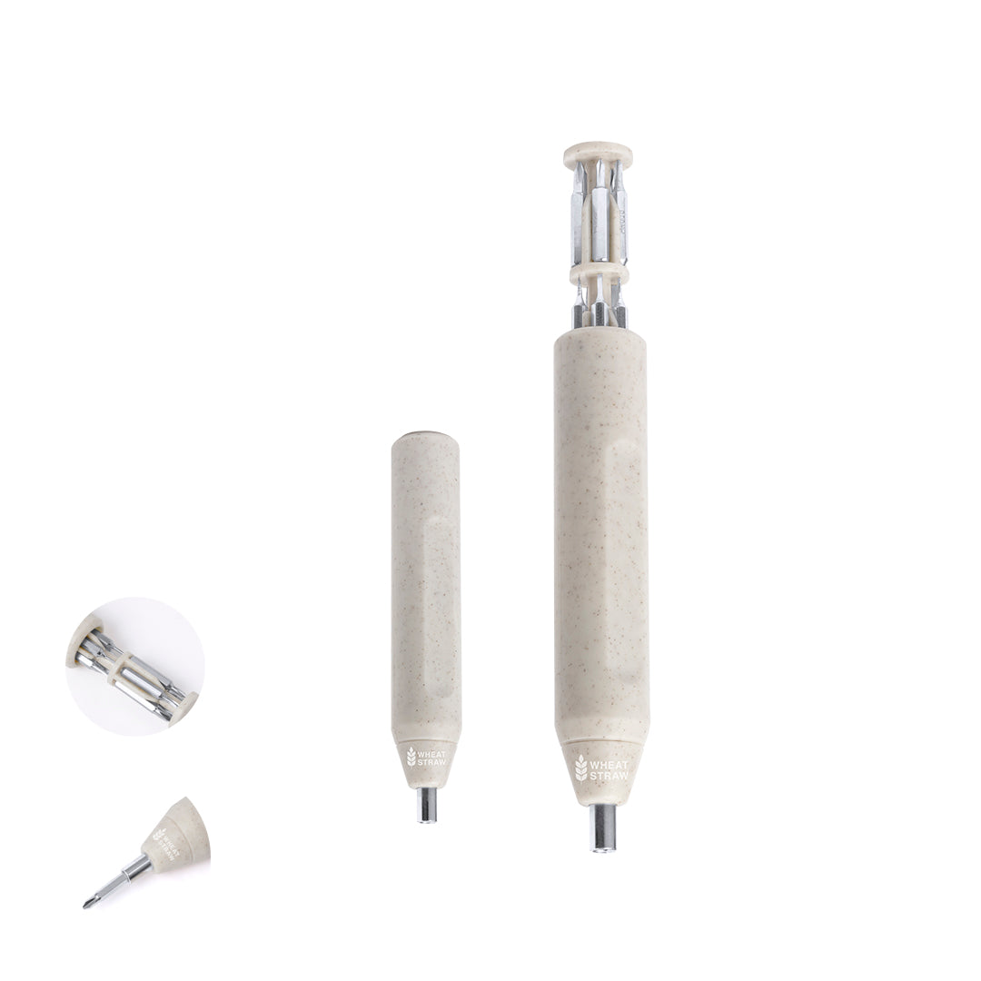 Práctica multiherramienta fabricada en caña de trigo con forma de destornillador. Incluye un compartimento en la empuñadura para guardar las múltiples puntas magenéticas (planas y philips). Con logotipo caña de trigo incluido. Presentada en caja de diseño kraft. La caña de trigo fomenta la utilización de materias primas naturales, reduciendo así las emisiones contaminantes.