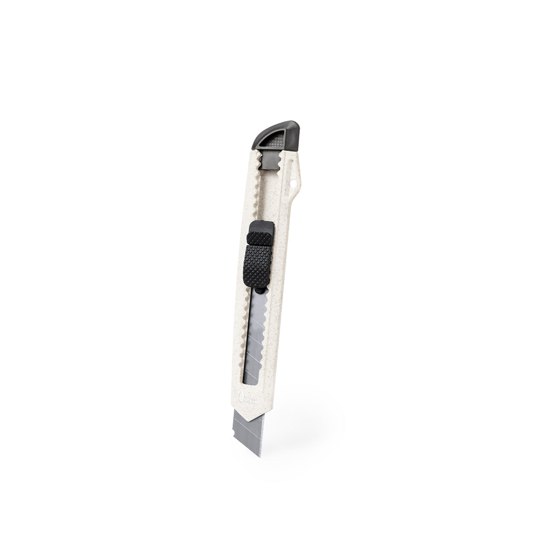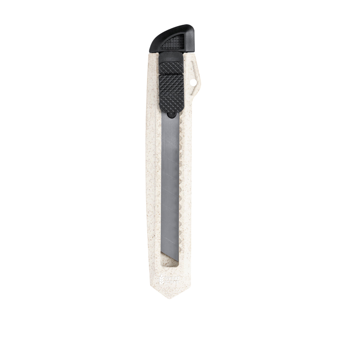 Cutter con cuchilla ancha fabricado en caña de trigo. Mango ergonómico troquelado con capucha extraíble para ajuste de corte de cuchilla, con mecanismo de bloqueo para mayor seguridad. Con logotipo caña de trigo incluido. Presentado individualmente en bolsa de papel reciclado. La caña de trigo fomenta la utilización de materias primas naturales, reduciendo así las emisiones contaminantes.