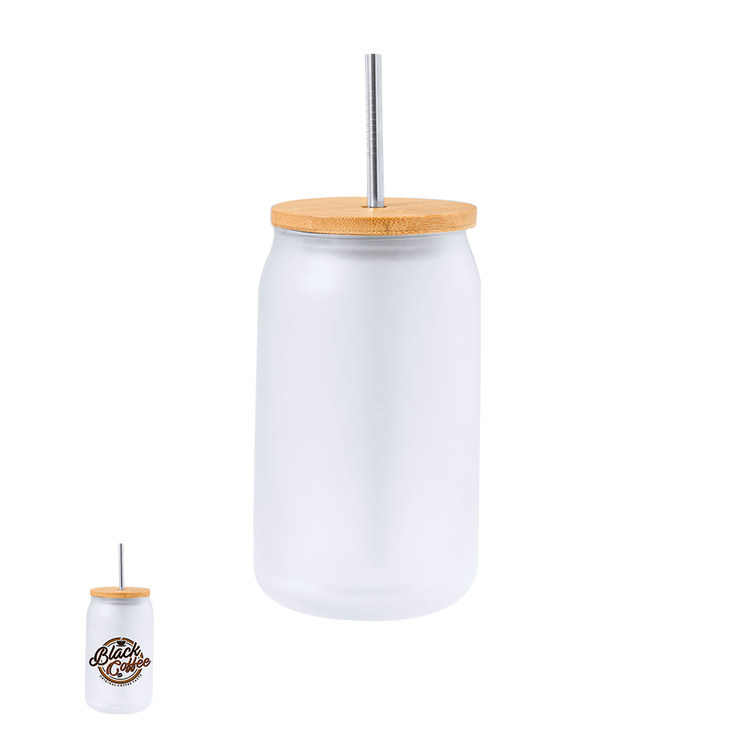 Tarro de sublimación con cuerpo fabricado en resistente cristal mate, con 400 ml de capacidad. Tapa en bambú a presión con orificio para pajita (pajita incluida y fabricada en acero inox). Especialmente diseñada para marcaje en sublimación. Presentada en caja individual kraft.