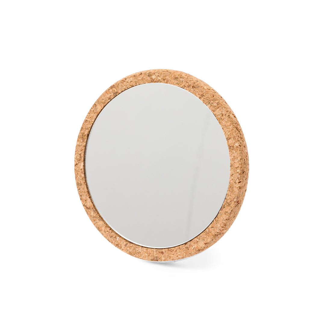 Espejo 1X fabricado en corcho. Práctico espejo portátil recubierto de suave corcho y presentado en una caja individual diseño kraft.