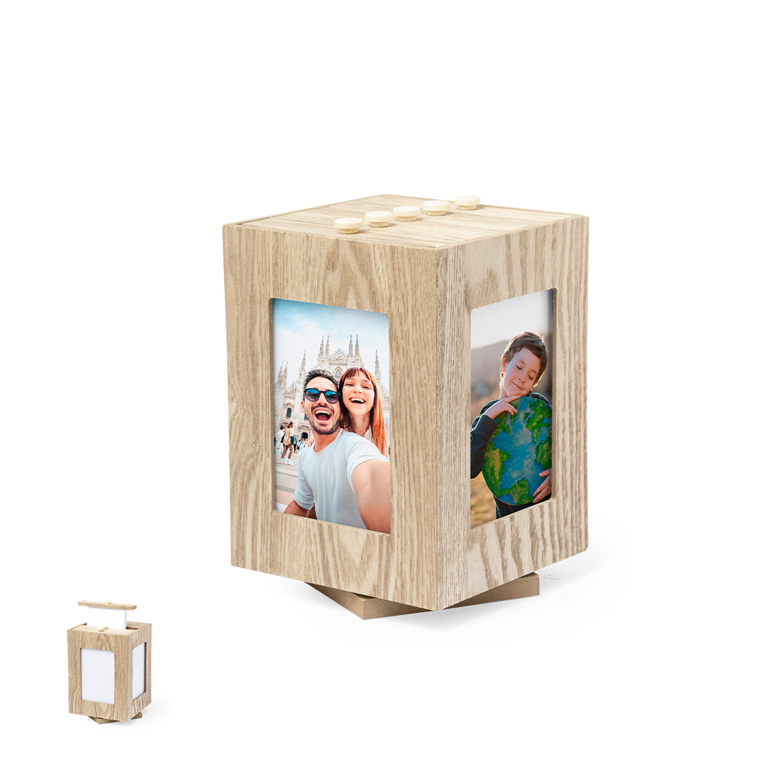 Original portafotos cubo fabricado en madera natural. Su diseño en forma de cubo permite mostrar las 4 fotos más destacadas del álbum y, además, cuenta con una base giratoria 360º. Ideal para fotos de hasta 13,5x9 cm. Presentado en caja individual de diseño kraft.