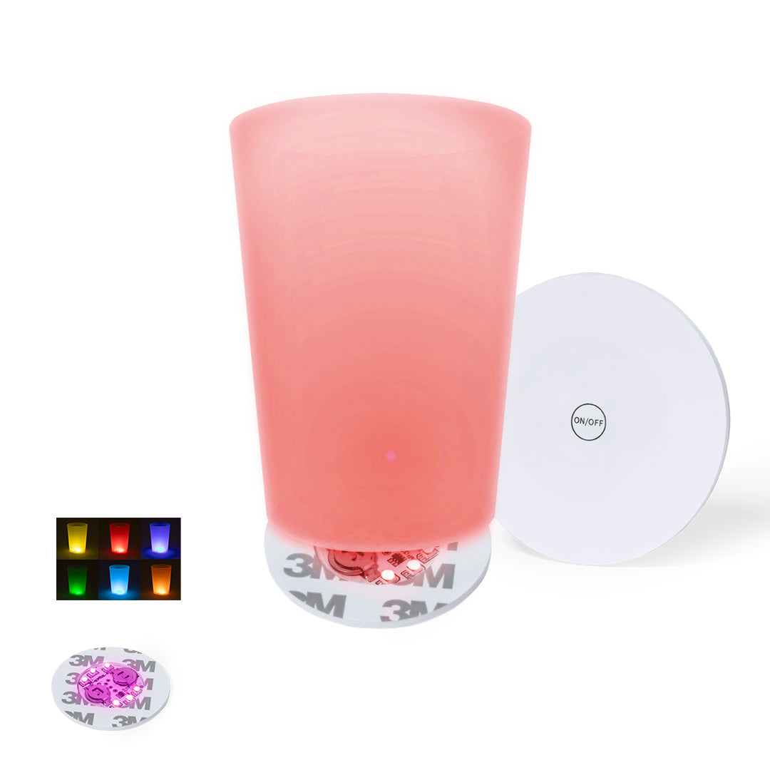 Original posavasos con 6 LEDs para iluminar las bebidas. Con botón en la base y diferentes posiciones de iluminación: en colores fijos o variados. Se fija a la base de cualquier bebida con cinta autoadhesiva y está alimentado por dos pilas de botón (incluidas).