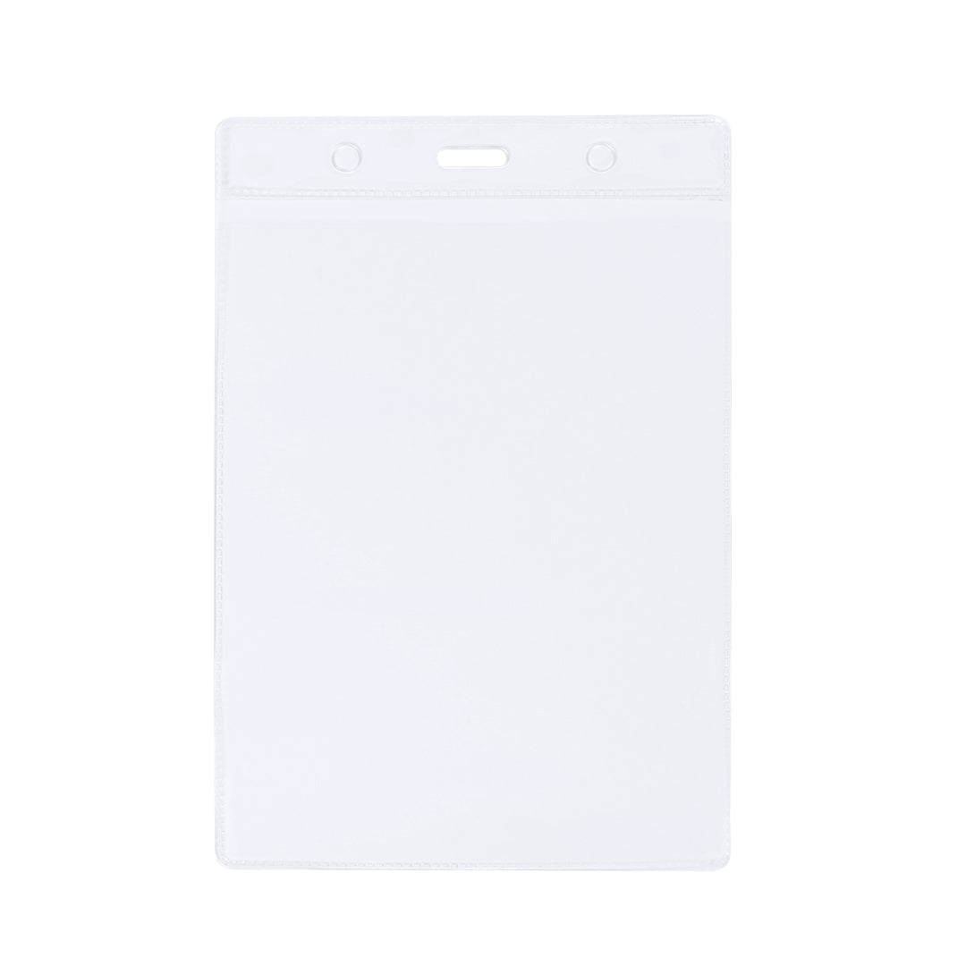 Identificador vertical de PVC. Práctico porta acreditaciones con parte superior reforzada y perforaciones tanto para la sujeción central como en los laterales.