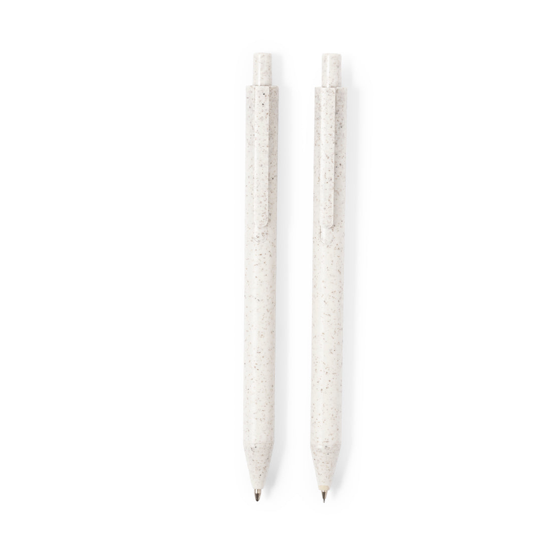 Set de bolígrafo y portaminas. Fabricados en caña de trigo con clip. Bolígrafo en tinta azul y portaminas con 2 minas incluidas de 0,7mm. Presentado en estuche individual de cartón reciclado. Logotipo Wheat Straw en la parte superior del bolígrafo y portaminas.La caña de trigo fomenta la utilización de materias primas naturales, reduciendo así las emisiones contaminantes.