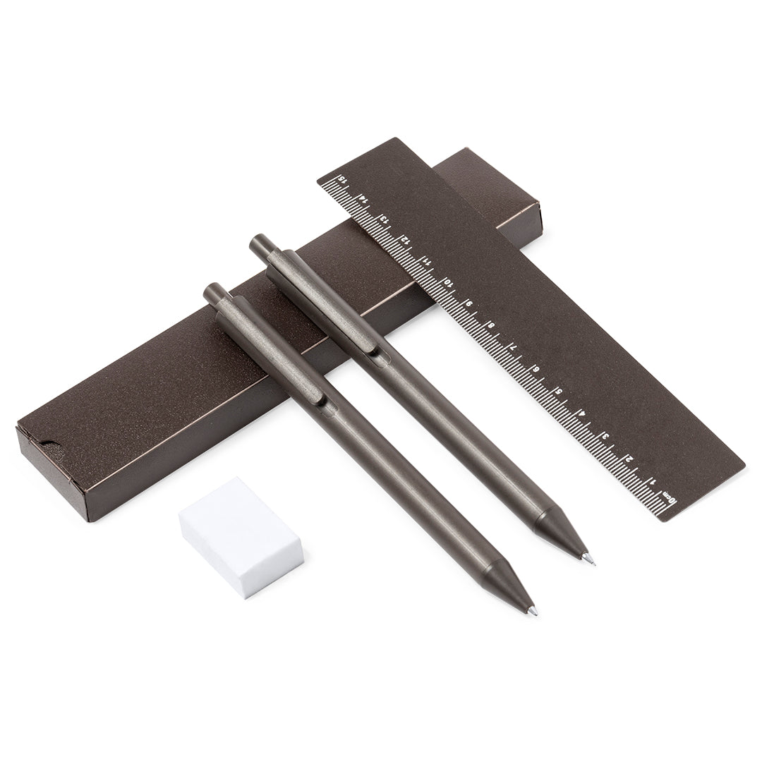Set de bolígrafo, portaminas y regla, fabricados en fibra de café. Bolígrafo en tinta azul y portaminas con 2 minas incluidas de 0,7mm, ambos con clip. Incluye una práctica regla de 15 cm y útil goma. Presentado en estuche individual de fibra de café. Logotipo fibra de café en la parte superior del bolígrafo y portaminas.La fibra de café es una solución circular que se obtiene de la utilización de los residuos producidos en la obtención del café. Una alternativa sostenible que favorece la reducción del uso de plásticos, ahorrando energía en su proceso de fabricación y contribuyendo al cuidado del medio ambiente.