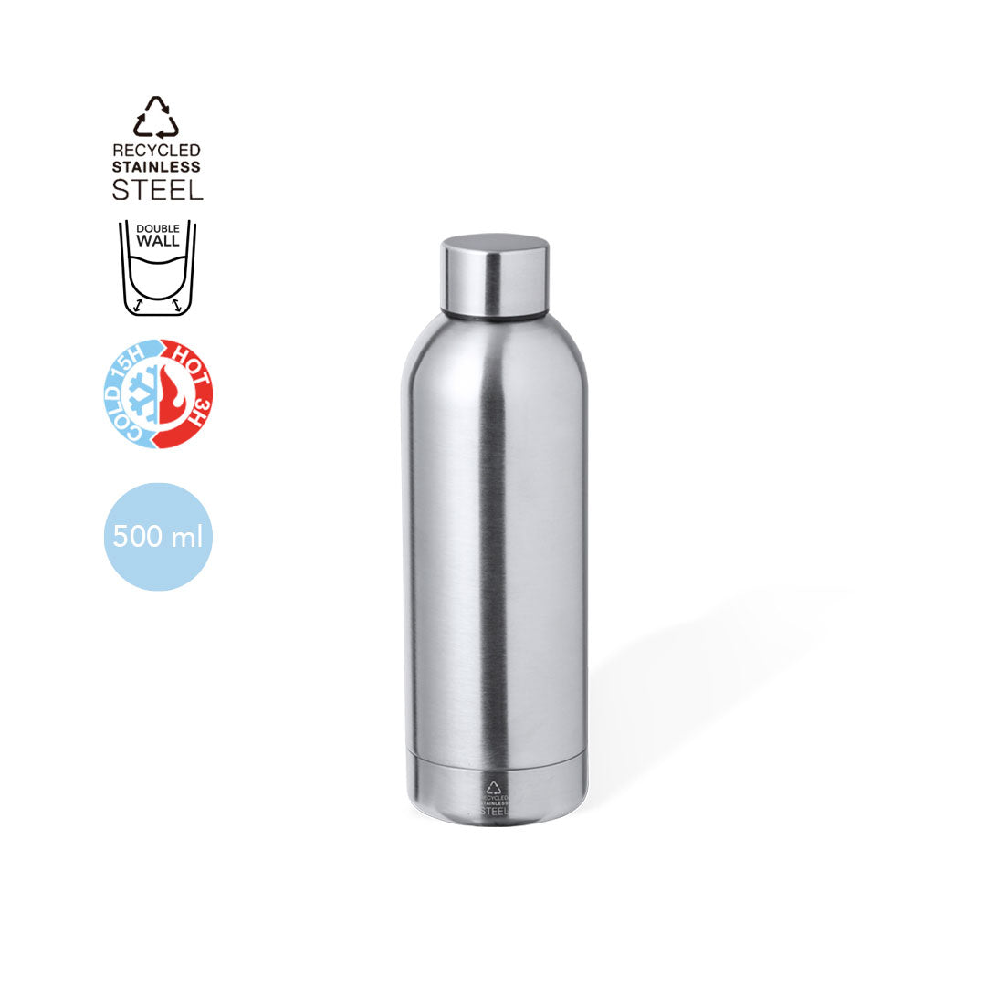 Bidón térmico de doble capa en Acero Inox Reciclado de 500 ml de capacidad. Cierre de rosca para un sellado óptimo y con logotipo Acero Inox Reciclado. Presentado en atractiva caja de diseño kraft.El acero es uno de los materiales más demandados y que puede encontrarse casi en todas partes, desde productos de uso diario a grandes construcciones. Con innumerables propiedades, entre las que cabe destacar la durabilidad y su alto grado de reutilización, convirtiéndolo en una alternativa muy valorada en soluciones de sostenibilidad. Debidamente tratado, permite obtener nuevos recursos de infinita utilización.