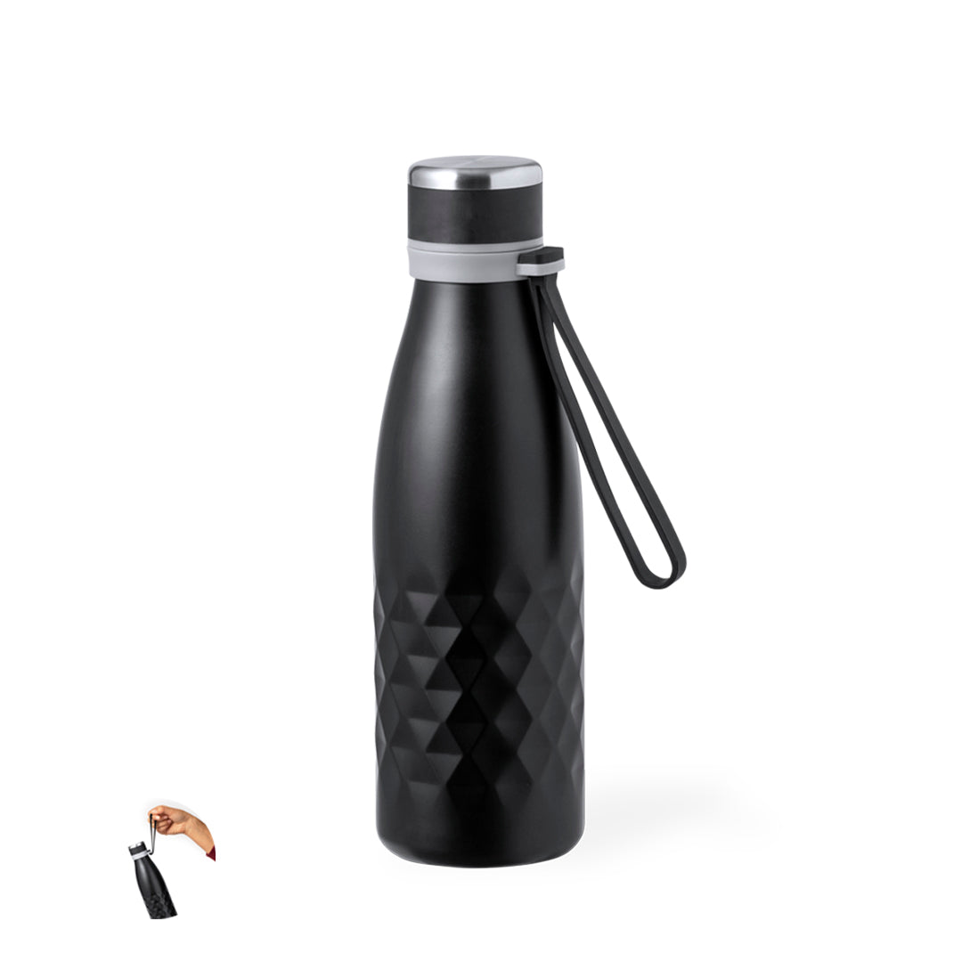 Elegante bidón térmico de 550 ml de capacidad, fabricado en acero inox de doble pared, con tapón a rosca para un óptimo sellado. Incluye una cómoda asa a juego en agradable silicona. Disponible en variada gama de colores metalizados, con elegante patrón en rombo alrededor del cuerpo. Presentado en caja individual de diseño kraft.