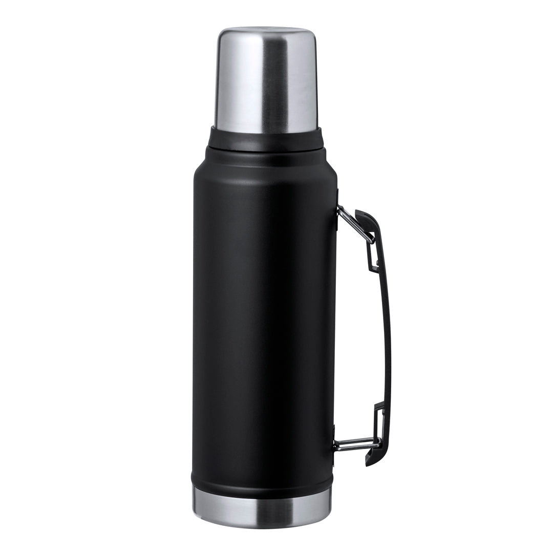 Termo de acero inox de 1L de capacidad. Combinación de color negro con acero pulido de elegante acabado, de cierre de rosca con tapón en forma de vaso de 200 ml y asa en el lateral para un fácil transporte. Presentado en caja de diseño kraft.