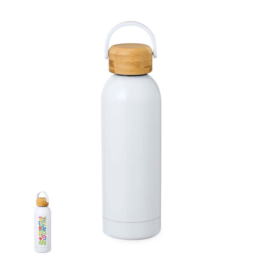 Bidón térmico de 500 ml de capacidad, fabricado en acero inox de doble pared y especialmente diseñado para marcaje en sublimación. De acabado blanco brillo, con tapón a rosca y asa superior para un fácil agarre, libre de BPA. Presentado en caja individual de diseño kraft.
